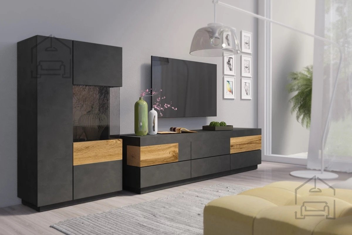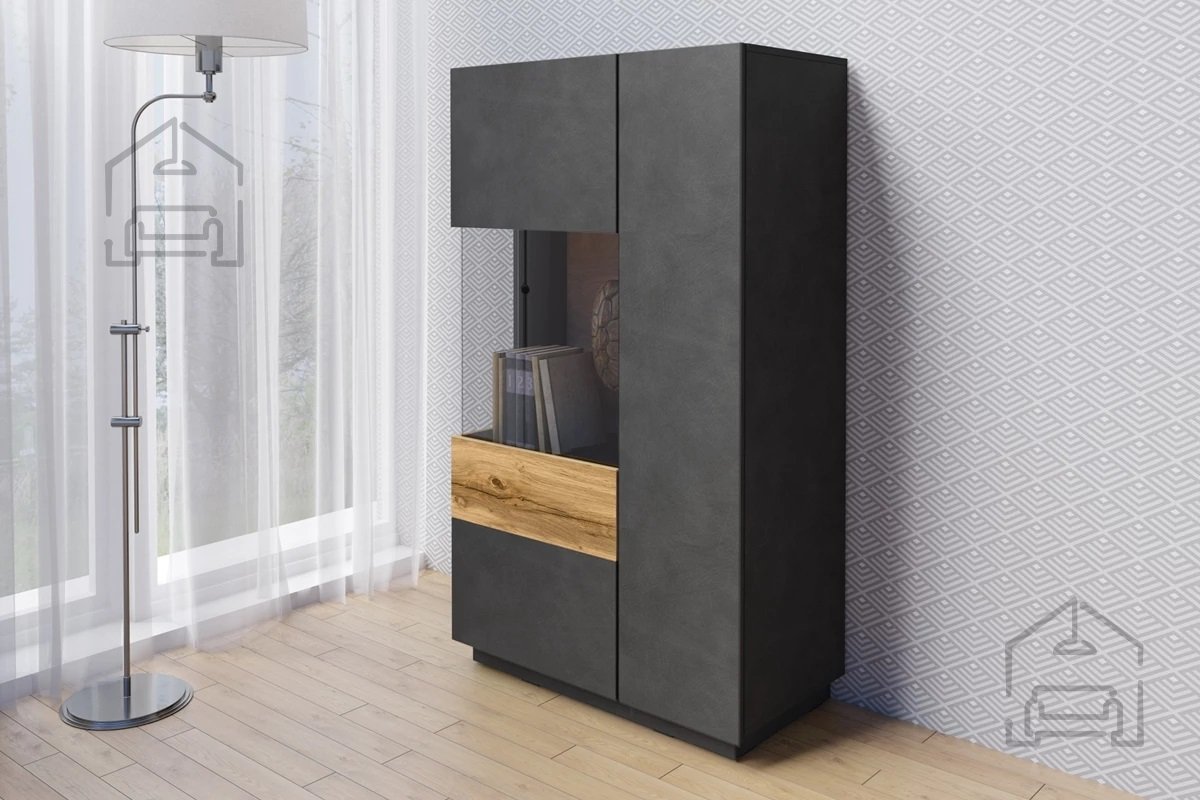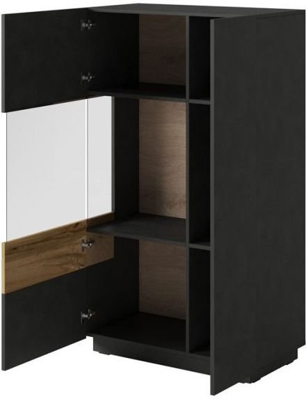 Der besondere Reiz der Vitrine Silke liegt in ihrer Farbkombination. Die schwarze matte Korpusfarbe bringt Eleganz und Raffinesse, während die Votan-Eiche an den Fronten Wärme und eine natürliche Note hinzufügt. Diese harmonische Farbkombination bereichert jeden Raum, egal ob Wohnzimmer, Esszimmer oder Büro.
