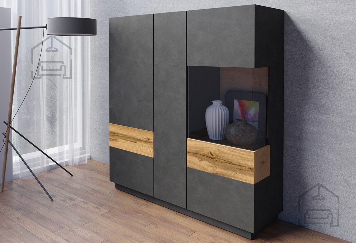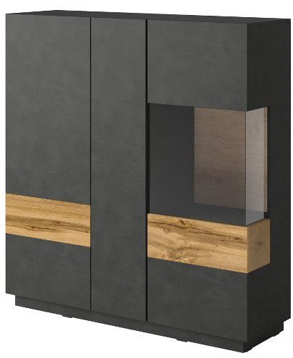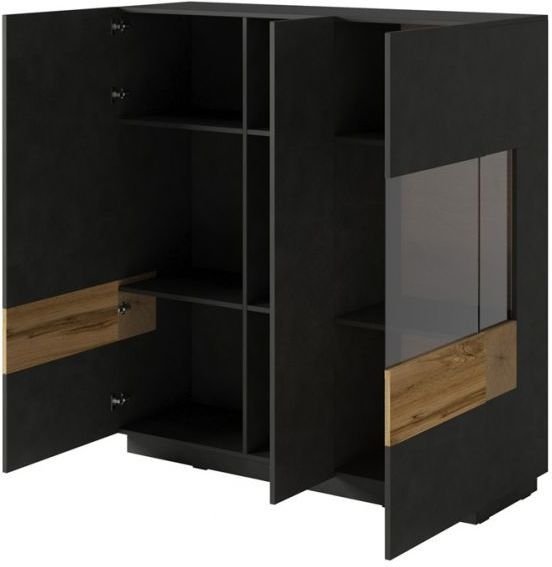 Die Vitrine besteht aus hochwertigem MDF-Material, das Stabilität und Langlebigkeit garantiert. Das schwarze matte Korpusdesign harmoniert raffiniert mit den Fronten in Wotan-Eiche und schafft so ein modernes und zugleich natürliches Erscheinungsbild. Dieser Kontrast zwischen Schwarz und Eiche verleiht Ihrem Raum einen Hauch von Eleganz und Wärme.