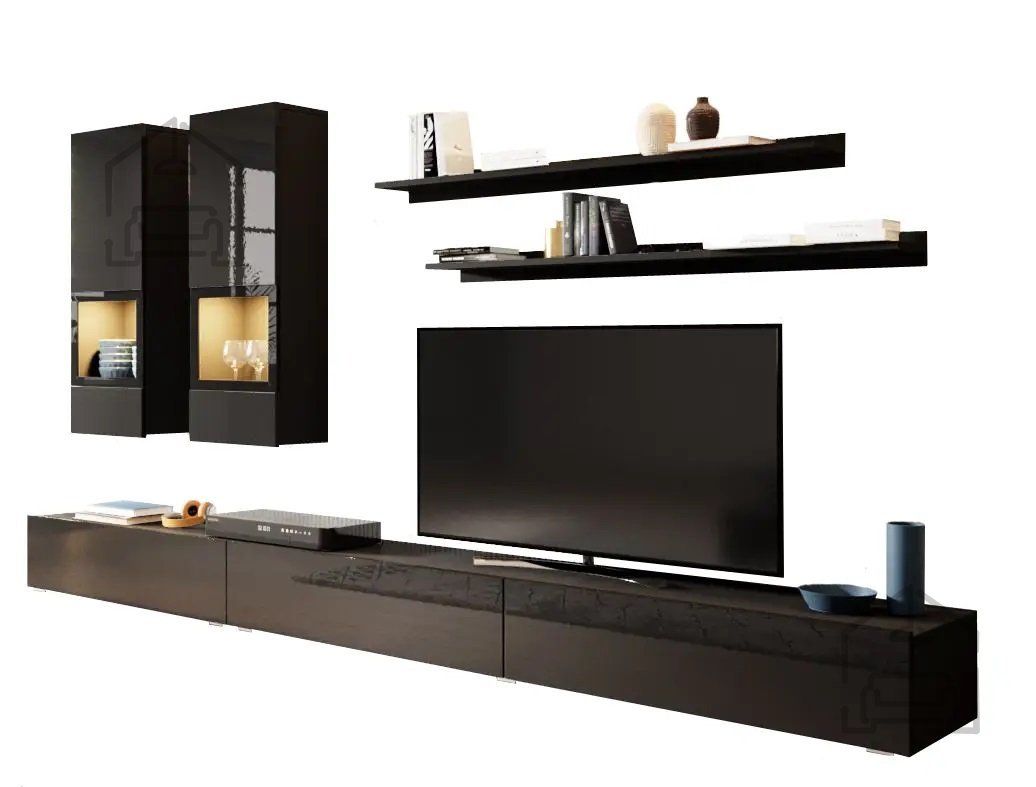 Wir präsentieren Ihnen die Wohnwand Athens in schwarzer Supermatt-Ausführung, die Ihrem Wohnzimmer einen Hauch von Raffinesse und modernem Design verleiht. Dieses wunderschöne Möbelstück ist aus hochwertiger Spanplatte gefertigt, was Langlebigkeit und eine lange Lebensdauer garantiert, und gleichzeitig ein elegantes Erscheinungsbild bietet, das sich mühelos in jeden Raum einfügt.