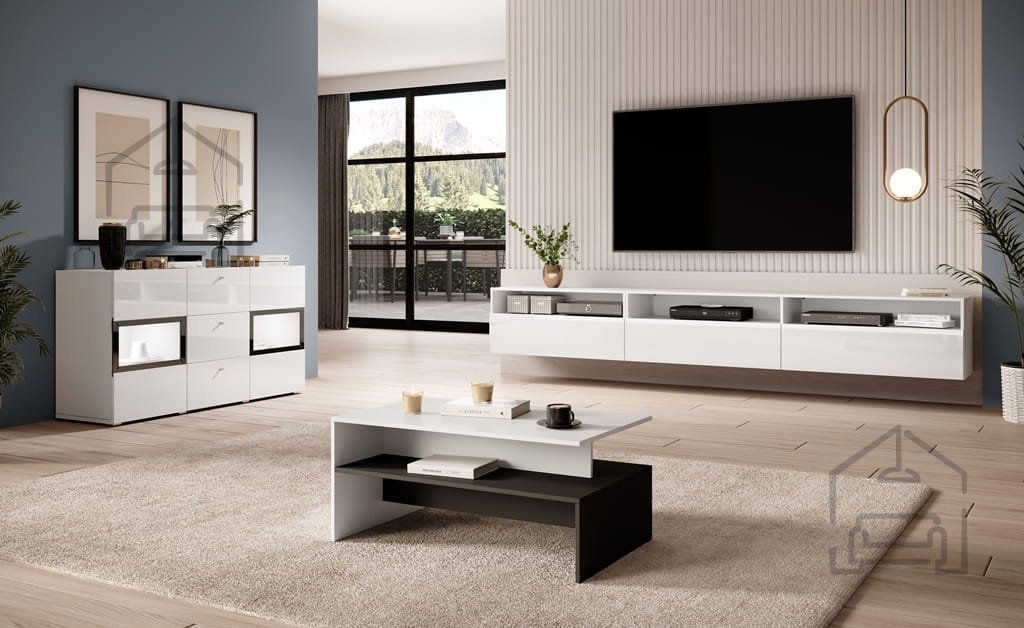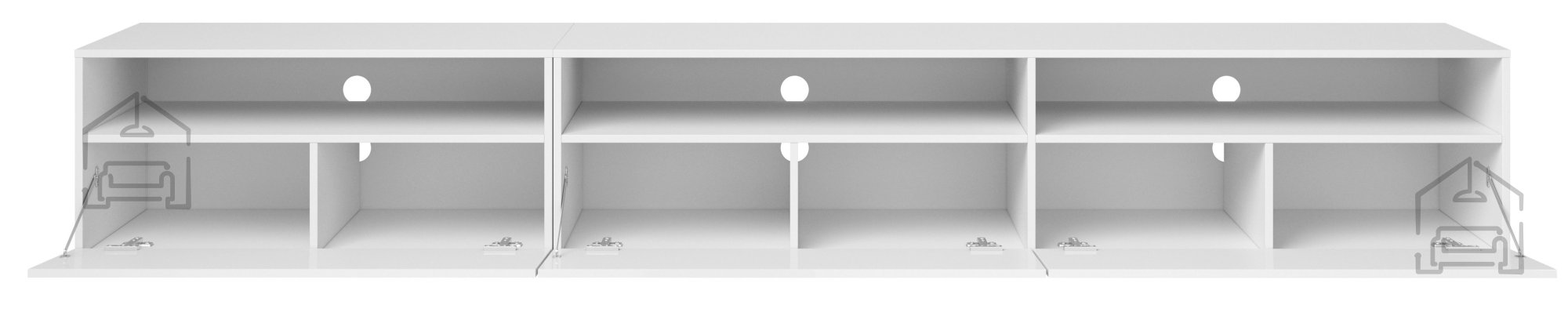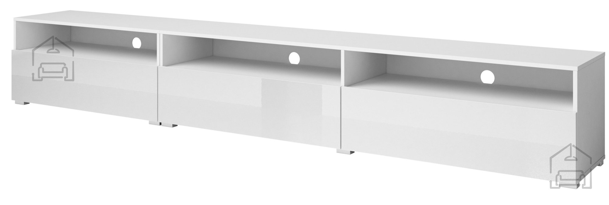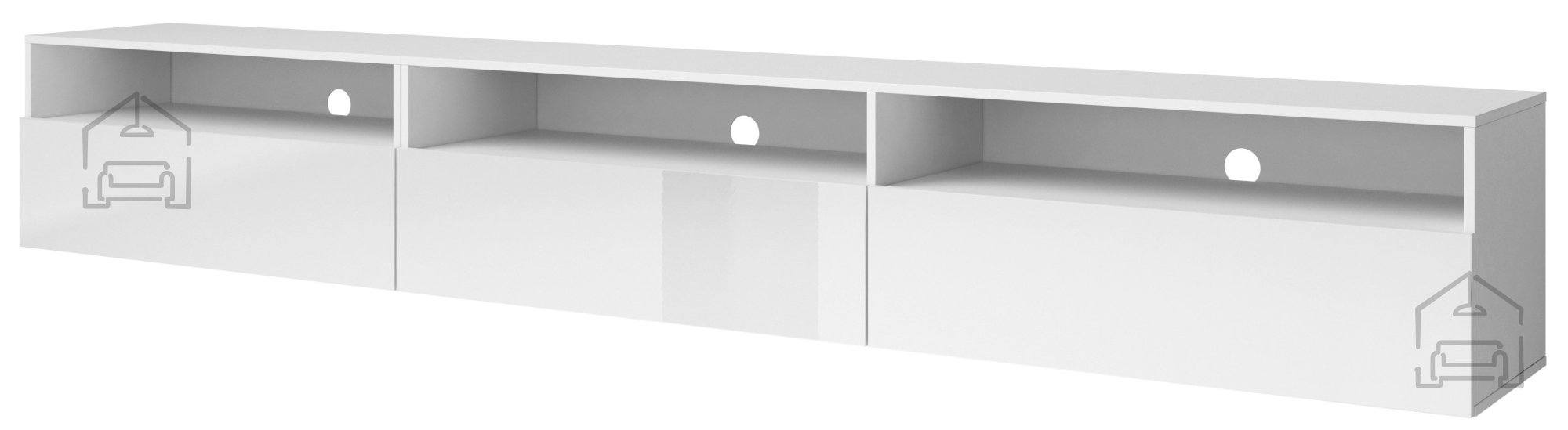 Elegantes Design: Die TV-Kommode Baros wurde mit Blick auf moderne Interieurs entworfen. Die weiße Hochglanzfarbe verleiht einen Hauch von Eleganz, der sich nahtlos mit verschiedenen Einrichtungsstilen – von minimalistisch bis traditionell – kombinieren lässt.