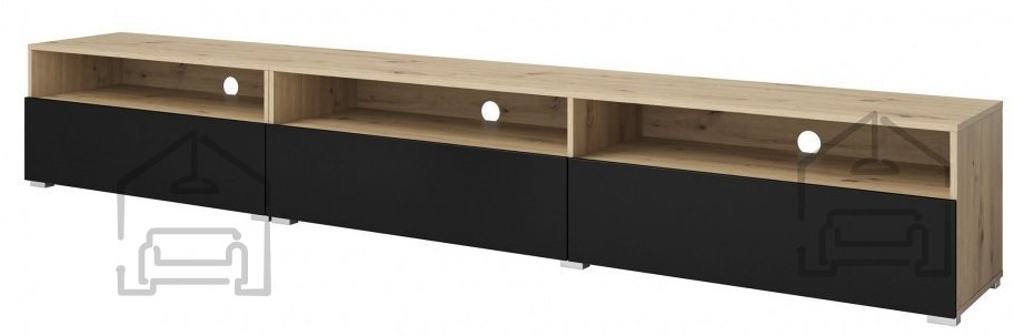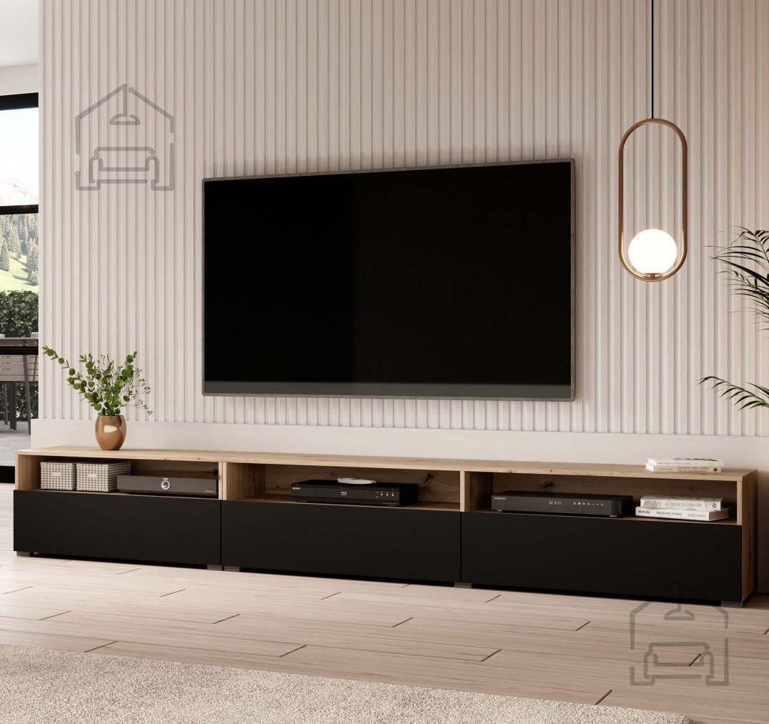 1. Geräumiges Design: Die Maße 270x41x42 cm bieten genügend Platz für Fernseher verschiedener Größen sowie andere Mediengeräte. 2. Hohe Materialqualität: Gefertigt aus langlebiger Spanplatte, die eine lange Nutzungsdauer gewährleistet. 3. Elegante Farbkombination: Die Farbgebung Artisan/Schwarz Supermatt passt zu vielen Einrichtungsstilen, von modern bis klassisch. 4. Funktionalität: Mehrere Schubladen und Regale sorgen für Ordnung und Organisation Ihrer Medienzubehörteile und anderer Gegenstände. 5. Zuverlässigkeit: Hergestellt in der angesehenen Fabrik Helvetia Meble, was höchste Qualität und Verlässlichkeit garantiert.