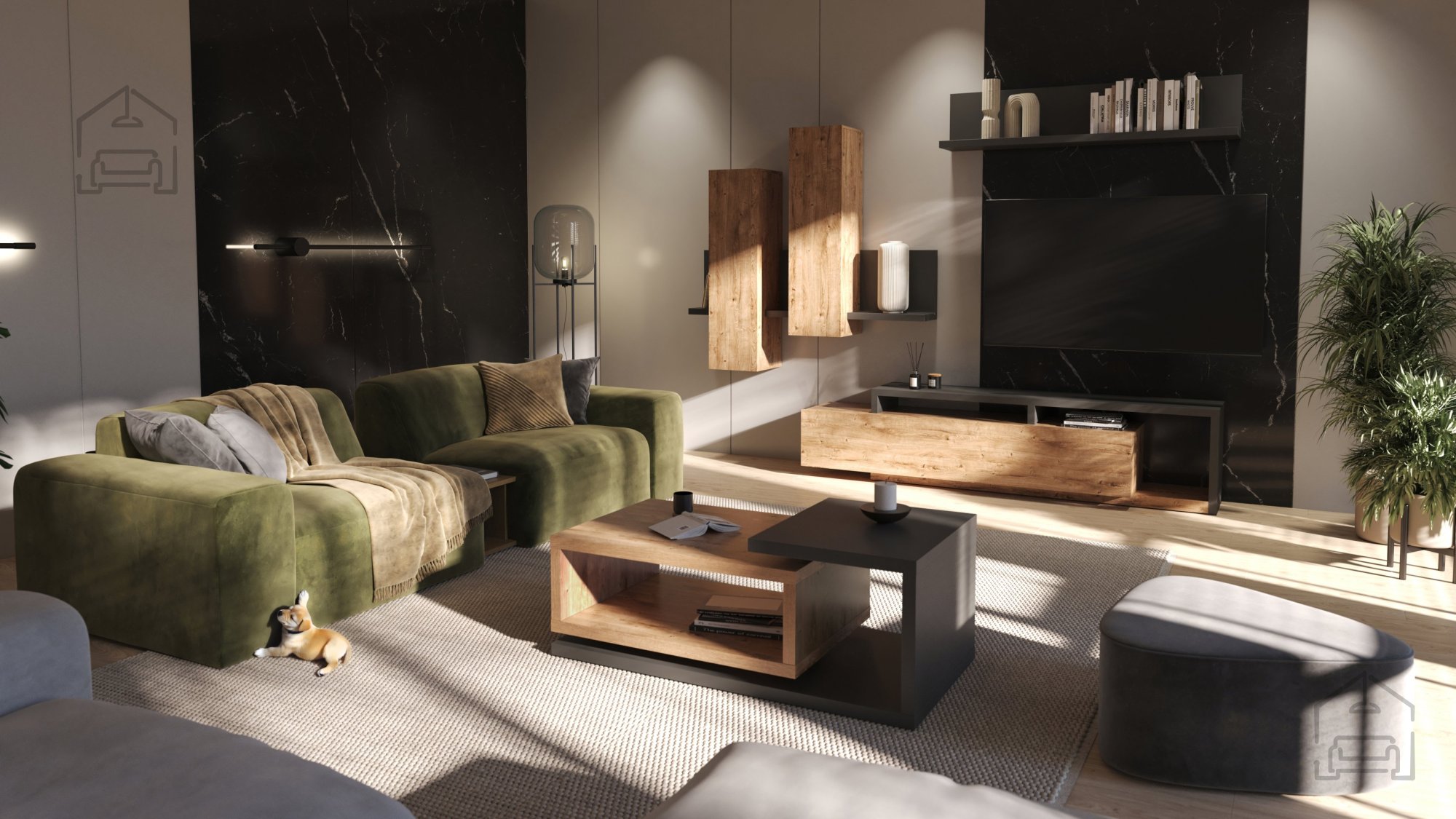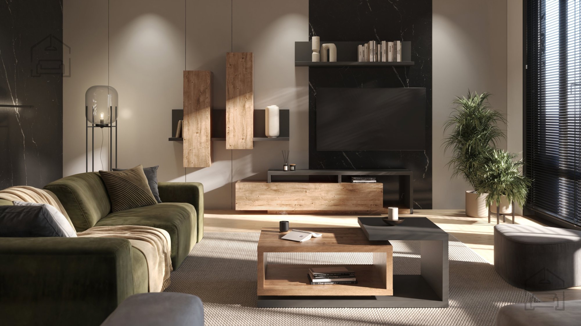 Die moderne Möbelkollektion für das Wohnzimmer Bota, in einer außergewöhnlichen Farbkombination aus Anthrazit und Ribbec-Eiche, bringt Frische und modernen Stil in Ihr Zuhause. Helvetia Meble aus Polen hat mit der Linie Bota zeitlose Stücke geschaffen, die Ästhetik und Nachhaltigkeit vereinen. So konzipiert, dass sie in jedes Zuhause passt, wird diese Kollektion nicht nur Ihren Raum vervollkommnen, sondern ihm auch Charakter und Funktionalität verleihen.