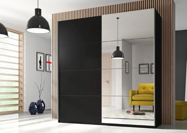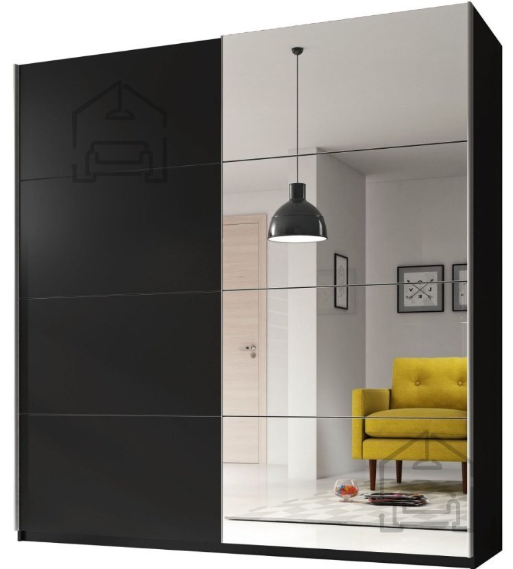 Der Kleiderschrank Beta überzeugt mit seinem eleganten schwarzen Design, das es ermöglicht, ihn mühelos in jedes moderne oder klassische Interieur zu integrieren. Die schwarze Farbe von Korpus und Front, kombiniert mit dem integrierten Spiegel, verleiht nicht nur einen Hauch von Eleganz, sondern vergrößert den Raum auch optisch – besonders vorteilhaft in kleineren Schlafzimmern oder Ankleideräumen.