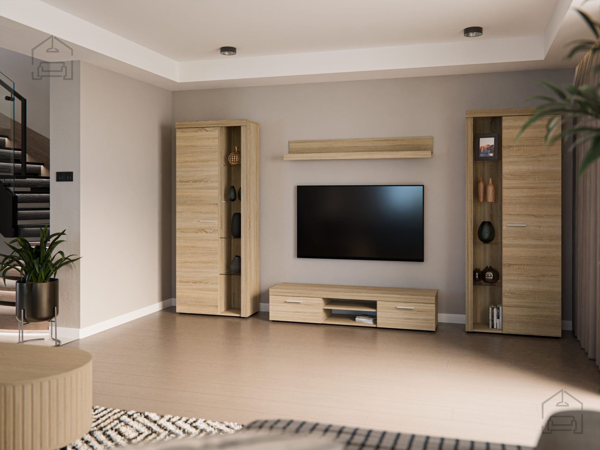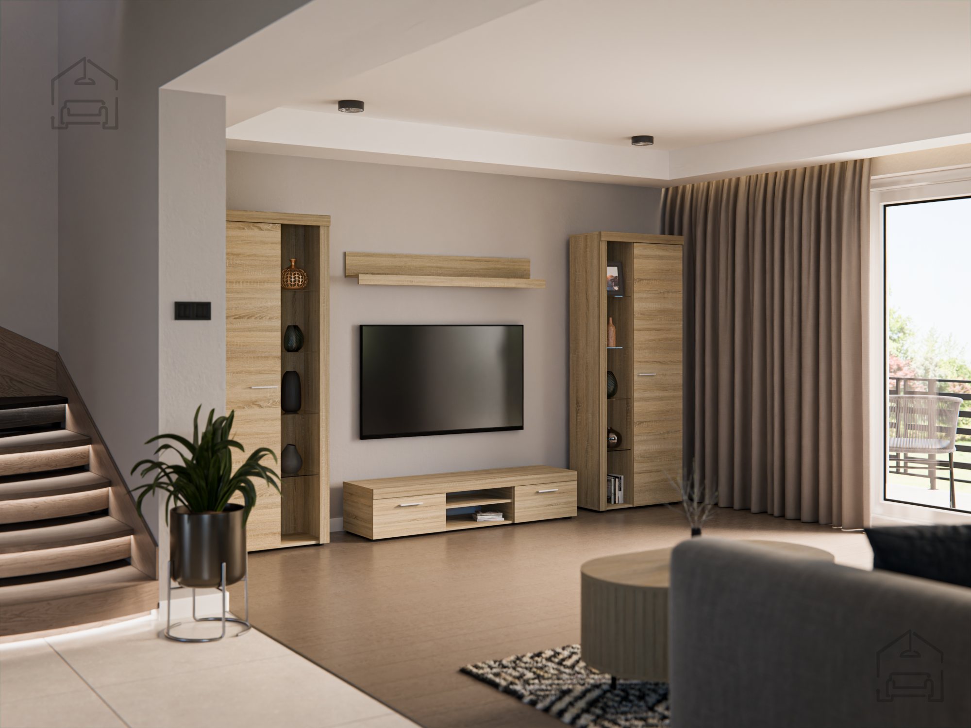 Im modernen Zuhause ist die Fernsehecke längst nicht mehr nur ein Ort zum Anschauen beliebter Sendungen, sondern wird zum zentralen Teil des Wohnzimmers, wo sich Funktionalität, Ästhetik und Geselligkeit vereinen. Deshalb ist es wichtig, dass die Möbel, die wir für diesen Raum auswählen, durchdacht gestaltet sind und eine komfortable Nutzung sowie ästhetische Harmonie mit anderen Elementen der Inneneinrichtung ermöglichen. Das TV-Regal Rumba XL in der Farbe Eiche Sonoma erfüllt mit seiner ausgewogenen Kombination aus der Wärme des natürlichen Holzes und modernen Linien diese Erwartungen perfekt. Sein beeindruckendes Erscheinungsbild wird durch durchdachte Abmessungen ergänzt, die ausreichend Platz für Fernseher, Audio-Video-Geräte und persönliche Dekorationsartikel bieten.