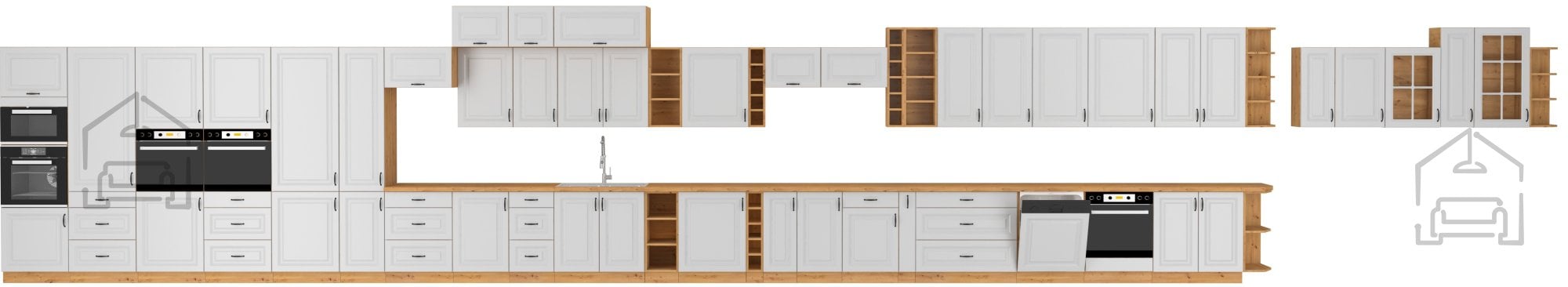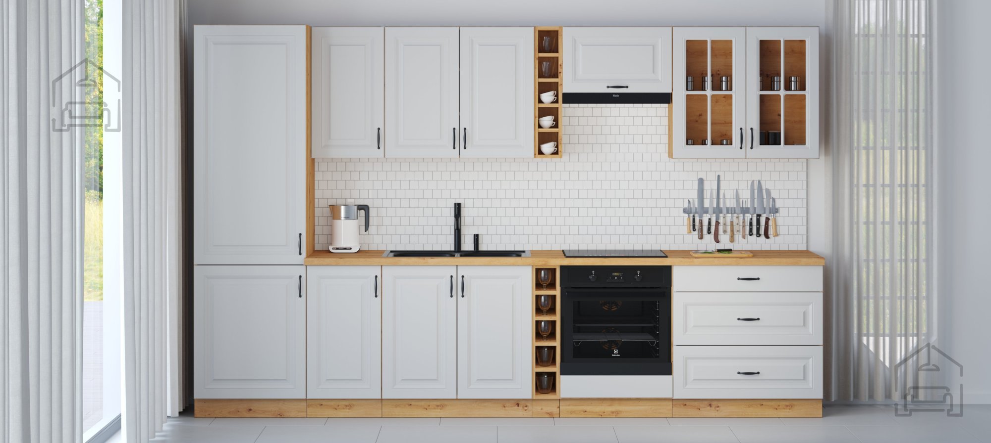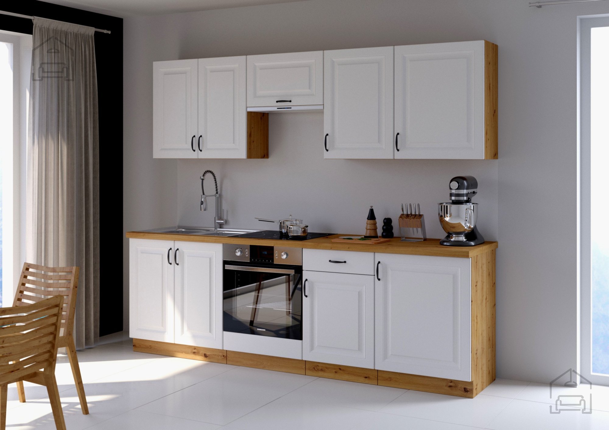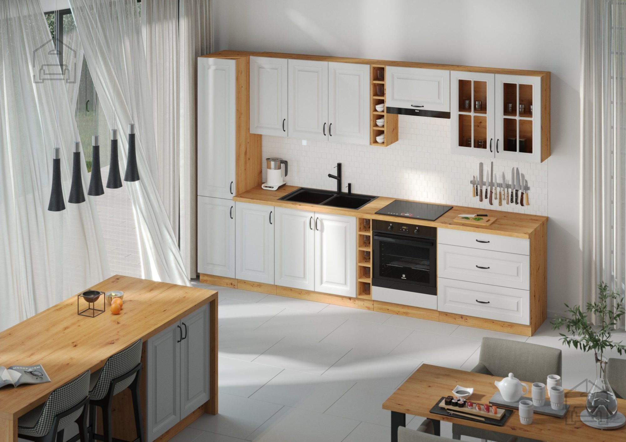 Die Küche Stilo, des polnischen Herstellers Stolarz-Lempert, ist für Liebhaber des klassischen Stils gedacht und zeichnet sich durch moderne Farben, geprägte Fronten und schwarze Metallgriffe aus. Die Kombination aus Weiß mit einer Holzimitat-Nuance wird selbst die anspruchsvollsten Geschmäcker begeistern. Weiß vergrößert den Raum optisch, während die Eichenholz-Nuance Wärme in den Innenraum bringt. Die Küchenkomposition Stilo wird das reiche Aussehen jedes Küchenraums betonen und ein harmonisches und beeindruckendes Interieur schaffen.