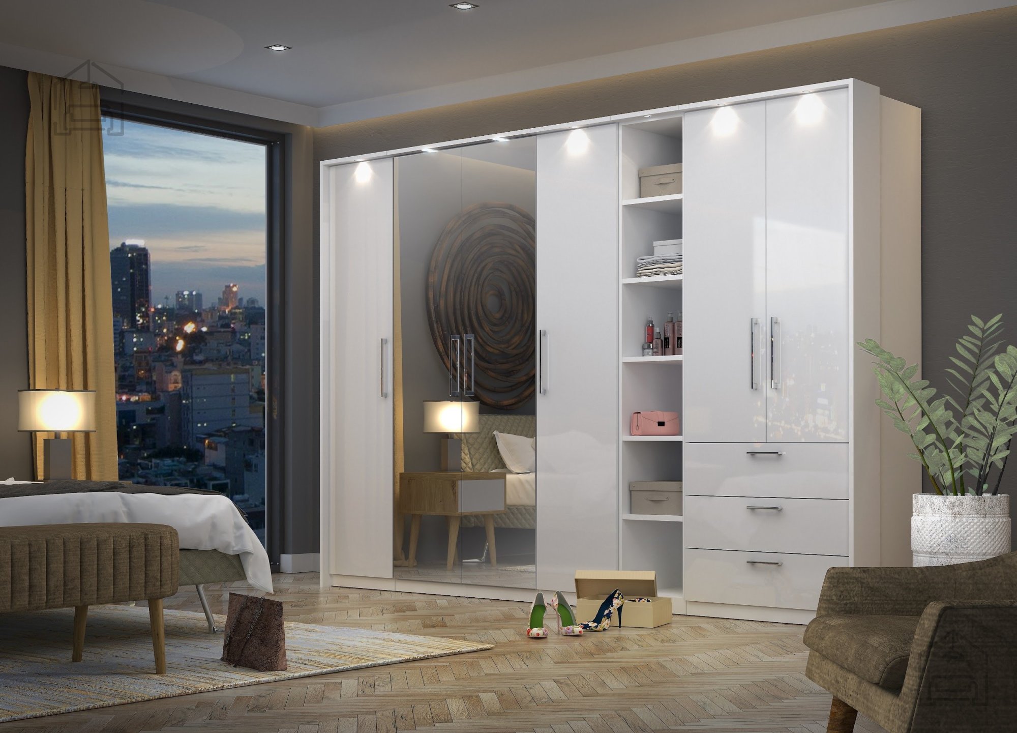Seine weiße Hochglanzfarbe fügt sich nahtlos in verschiedene Einrichtungsstile ein, von minimalistisch bis traditionell. Mit der optionalen LED-Beleuchtung können Sie die Inhalte der Regale hervorheben und eine warme, einladende Atmosphäre in jedem Raum schaffen.