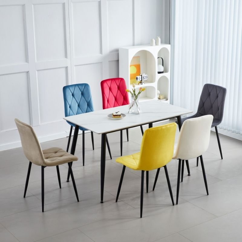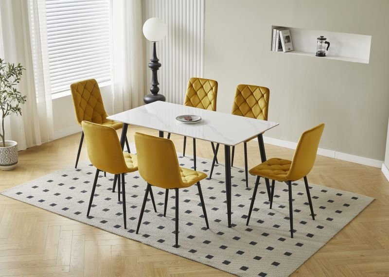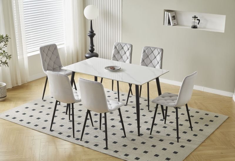 Der Esstisch mit weißem Marmor-Muster ist in mehreren Größen erhältlich.