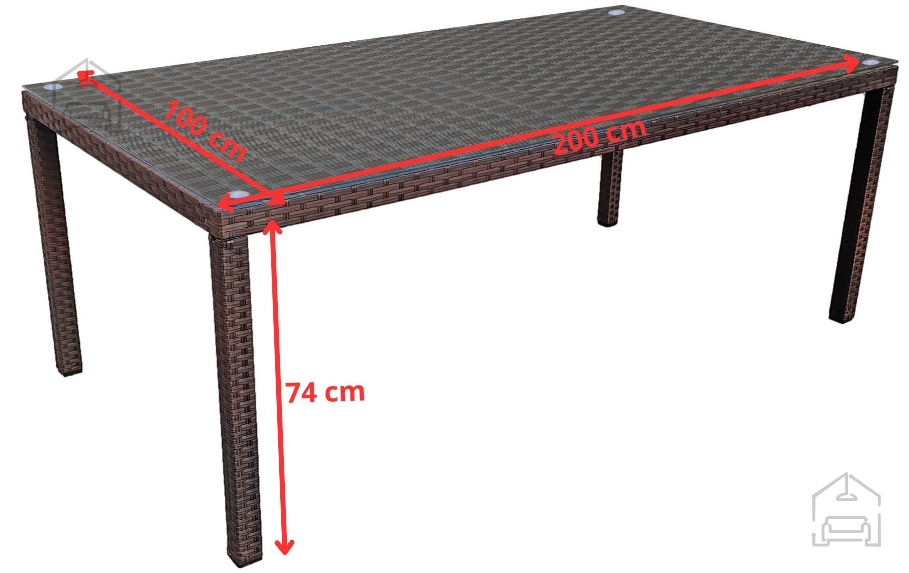 Der Tisch misst 200 cm in der Breite, 100 cm in der Tiefe und 74 cm in der Höhe. Diese Größe bietet bequem Platz für mehrere Personen – perfekt für Familienessen, Grillabende oder entspannte Treffen mit Freunden. Durch seine längliche Form eignet sich der Tisch besonders gut für größere Terrassen, Gärten oder überdachte Veranden. Die Glasplatte lässt sich leicht reinigen: einfach mit einem feuchten Tuch abwischen. Das Rattangeflecht sorgt dabei für eine angenehme, natürliche Optik.
