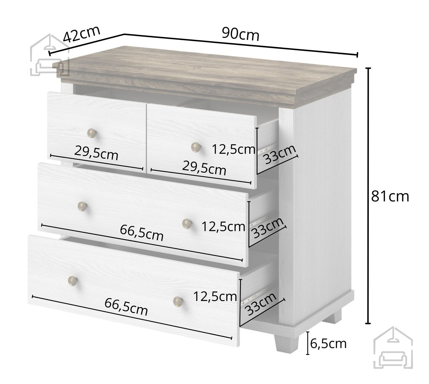 Die Kommode Klein Evora S misst 90x42x81 cm und ist damit ideal für verschiedene Räume, egal ob Sie sie im Wohnzimmer, Schlafzimmer oder Flur platzieren. Sie besteht aus einer hochwertigen laminierten Platte, die eine lange Lebensdauer und Widerstandsfähigkeit gewährleistet. Die laminierte Platte ist bekannt für ihre Robustheit und einfache Pflege, was bedeutet, dass Ihre Kommode auch nach vielen Jahren noch wie neu aussehen wird.