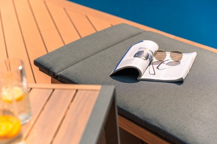 Der Liegestuhl Salzburg ist mit einer verstellbaren Rückenlehne ausgestattet, die eine vollständige Anpassung an Ihre Bedürfnisse ermöglicht – vom Sitzen beim Lesen bis zum vollständigen Liegen beim Sonnenbaden. Das Kissen aus gedrehtem Polyesterstoff ist weich und angenehm im Griff, trocknet jedoch schnell, da es keine überschüssige Feuchtigkeit aufnimmt. Diese Materialstruktur sorgt dafür, dass der Liegestuhl auch nach einem kurzen Sommerregen einsatzbereit ist. Die graue Farbe trägt zu einem eleganten und neutralen Erscheinungsbild bei, das gut zu verschiedenen Stilen von Gartenmöbeln passt.