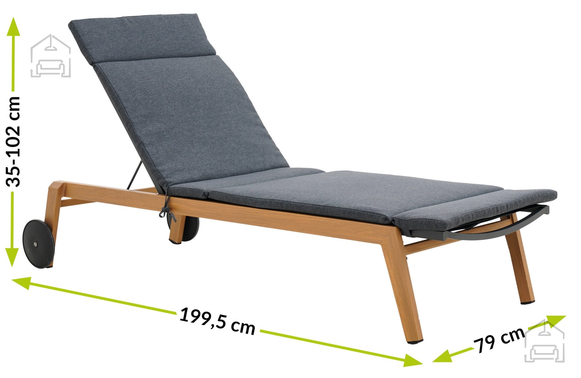 Der Rahmen des Liegestuhls ist aus Aluminium gefertigt, das für seine Korrosionsbeständigkeit und Leichtigkeit bekannt ist. Das bedeutet, dass der Liegestuhl für den Einsatz im Freien unter verschiedenen Wetterbedingungen geeignet ist, da das Material nicht rostet und seine Stabilität über Jahre hinweg behält. Die Räder am unteren Teil ermöglichen ein einfaches Bewegen, was bedeutet, dass Sie den Liegestuhl mühelos von Schatten in die Sonne verschieben oder ihn verstauen können, wenn Sie ihn nicht benötigen. Der ergonomische Griff erleichtert das Handling und das Bewegen auf unterschiedlichen Oberflächen zusätzlich.