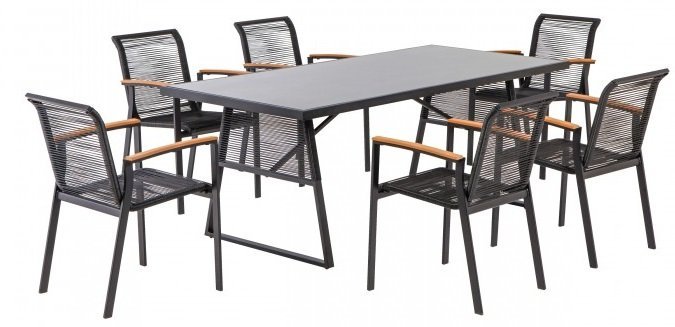 Das minimalistische Design des Sets passt perfekt zu einer modernen Gestaltung des Außenbereichs zur Entspannung. Die Kombination von Graphit mit armlehnen in Holzfarbe wirkt modern und stilvoll. Das elegante Set kann mit einer Gartenpergola kombiniert werden, die es Ihnen ermöglicht, sich auch bei weniger günstigem Wetter draußen zu entspannen.