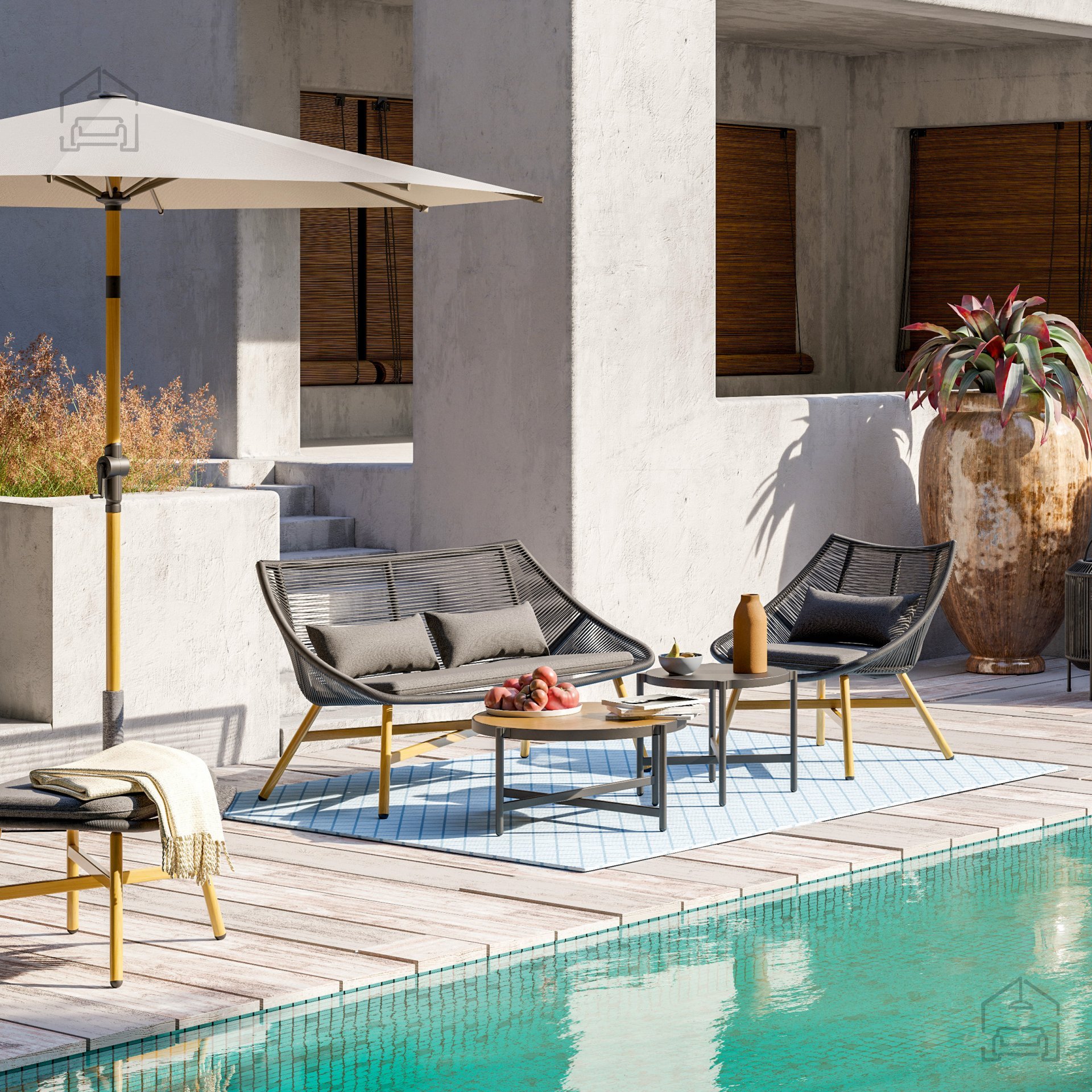 Kaffeegarnitur für 4 Personen. Das Set enthält ein 2-Sitzer-Sofa, 2 Sessel und 2 Tische. Die Konstruktionsweise des Aluminiumrahmens beeinflusst ihre Stabilität – die Möbel verformen sich nicht, sind stabil und langlebig. Die Sitzstoffe und das Polyrattan sind beständig gegen wechselnde Witterungsbedingungen und sorgen für Ruhekomfort. Sie bestehen aus verstärktem Material dank der Kissen und des weichen Polyesters, und für diese Kategorie zeichnen sie sich durch erhöhte Feuchtigkeitsbeständigkeit aus. Im Set sind 2 Couchtische enthalten, die im täglichen Gebrauch äußerst praktisch sind. Die Tischplatten aus Verbundstoff und gehärtetem Glas sind leicht zu reinigen.