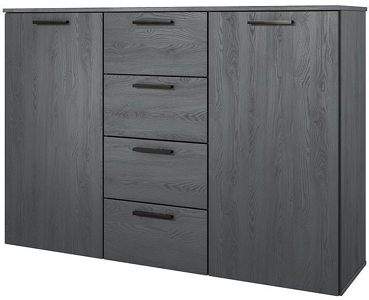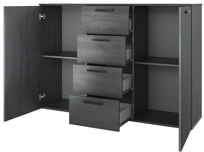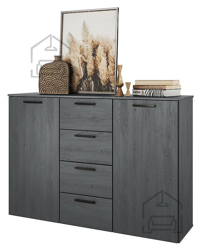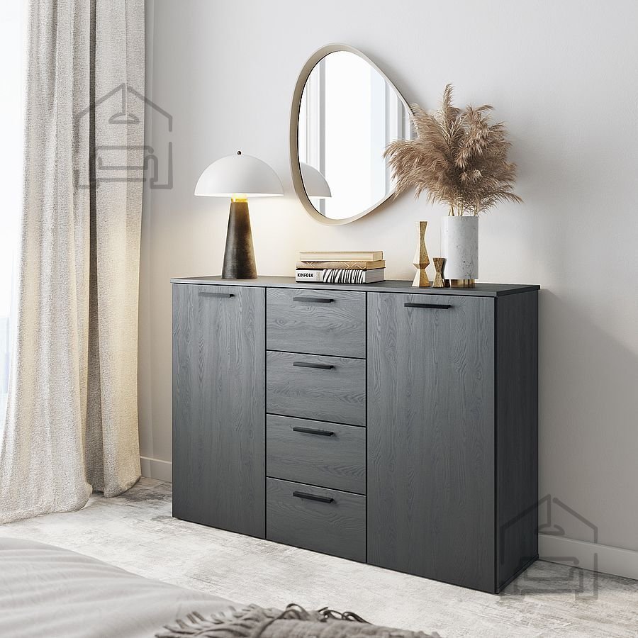 Entdecken Sie Raffinesse und Praktikabilität mit der Kommode Galaxy - Carbon Eiche - 24CBEA26, die eine erstklassige Wahl für alle darstellt, die modernes Design mit Funktionalität verbinden möchten. Hergestellt in der renommierten Fabrik Helvetia Meble in Polen, bietet diese Kommode mehr als nur ästhetische Attraktivität. Mit ihren Maßen 132 x 38 x 93 cm und der robusten Verarbeitung aus 16 mm starker laminierter Platte ist sie auf Langlebigkeit ausgelegt.