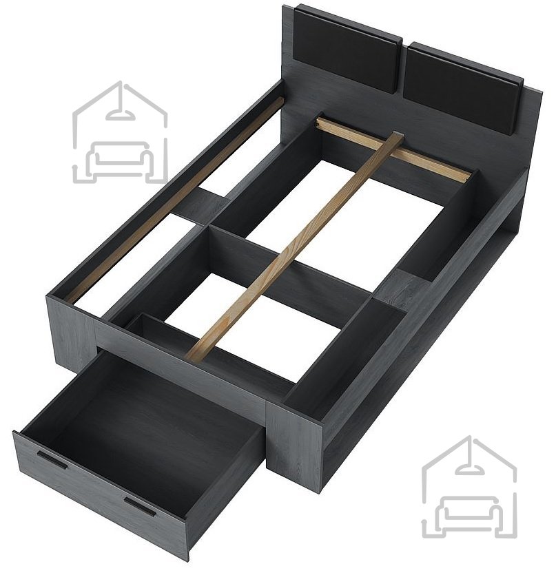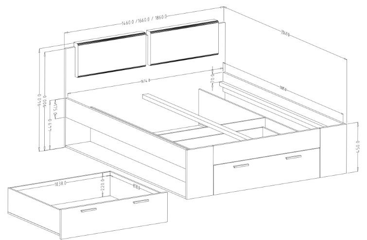 Obwohl das Bett weder über einen Hebemechanismus noch über ein Boxspring-System verfügt, gewährleistet seine robuste Konstruktion aus Spanplatte die Stabilität und Unterstützung, die Sie für einen erholsamen Schlaf benötigen. Matratze und Lattenrost können Sie selbst wählen, was eine perfekte Anpassung an Ihre Bedürfnisse und Wünsche ermöglicht.