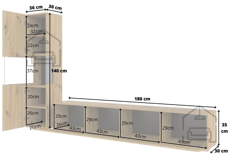 Gefertigt aus hochwertiger laminierter Platte, besticht die Wohnwand Ava durch ihre Widerstandsfähigkeit und Langlebigkeit. Ihre Farbgestaltung, eine Kombination aus Weiß und Wotaneiche, bringt Wärme und Eleganz in jeden Raum. Doch das ist nicht alles, was dieses Möbelstück zu bieten hat. Werfen wir einen Blick auf die wichtigsten Vorteile, die Sie überzeugen werden, warum die Wohnwand Ava die richtige Wahl für Sie ist.