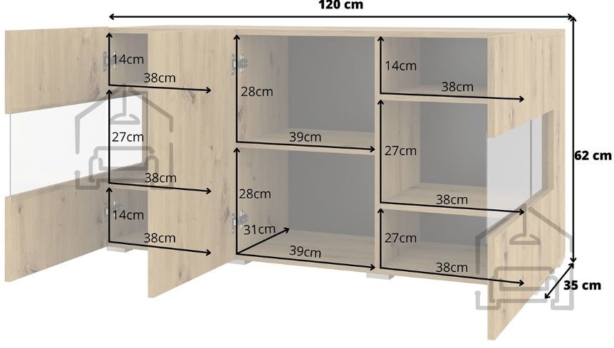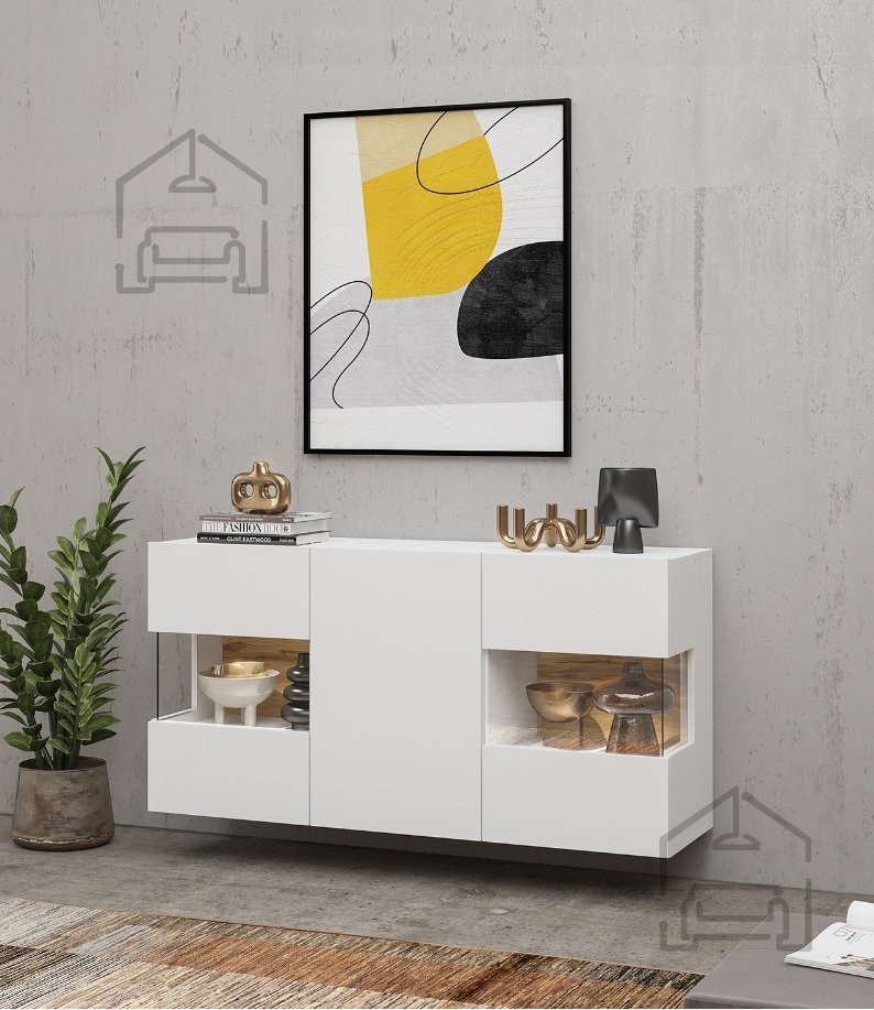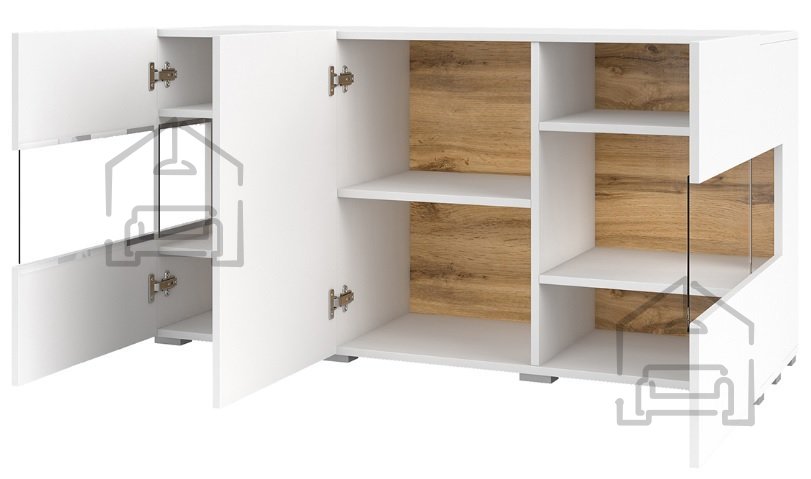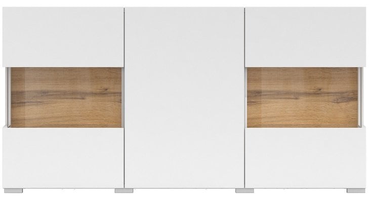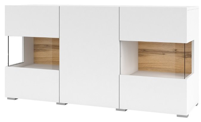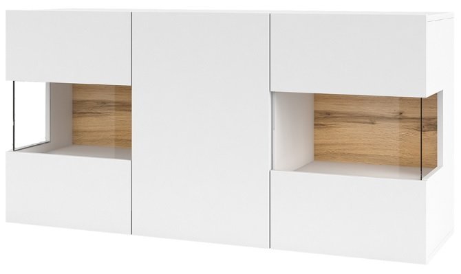 Die Kommode Ava misst 120x35x62 cm, was sie ideal für verschiedene Räume macht – entweder als Einzelstück oder als Teil einer größeren Kombination. Sie ist aus laminierten Platten gefertigt, was außergewöhnliche Haltbarkeit und Widerstandsfähigkeit gegen Kratzer, Feuchtigkeit und täglichen Gebrauch gewährleistet. Ihre Farbgestaltung, Weiß in Kombination mit Wotan-Eiche, bietet ein warmes und einladendes Aussehen, das sich problemlos an verschiedene Einrichtungsstile anpasst.