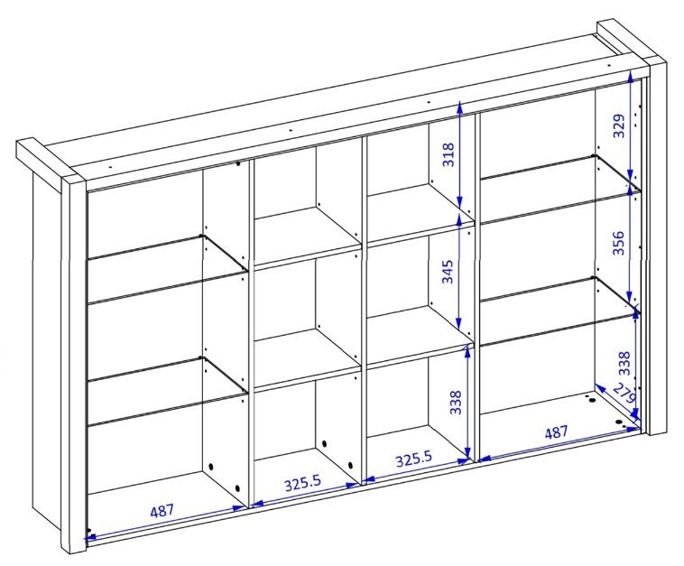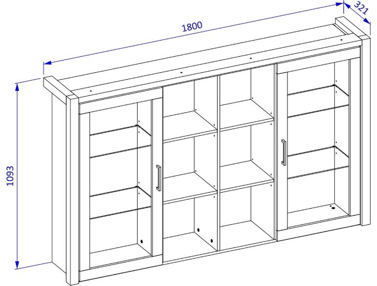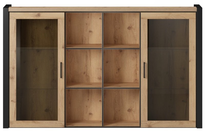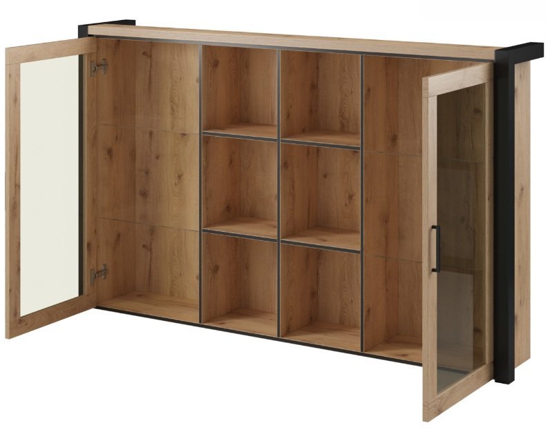 2 Fächer mit Glasböden und verglasten Türen, 4 offene Regale