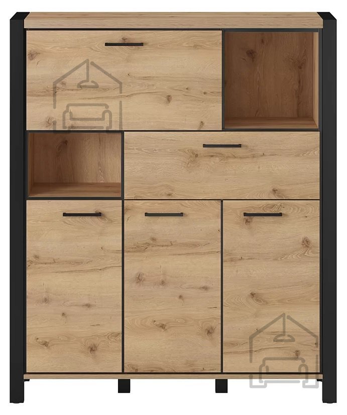 Die Möbelkollektion für Wohnzimmer AKTIV ist im industriellen Stil gestaltet, der sich durch Schlichtheit der Formen, Robustheit und Praktikabilität auszeichnet. Die ungewöhnliche Verarbeitung der Möbel verleiht jedem Interieur einen einzigartigen Charakter. Auf der Basis der Farbe von natürlichem Holz mit charakteristischer Struktur und Muster wird es von einem tiefen Schwarz eingerahmt. Diese Kombination wirkt sehr dynamisch, kontrastreich und gleichzeitig vollkommen! Die Kollektion mit mehreren Elementen bietet unbegrenzte Gestaltungsmöglichkeiten, während praktische Designlösungen die Schaffung eines schönen und funktionalen Wohnzimmers ermöglichen.