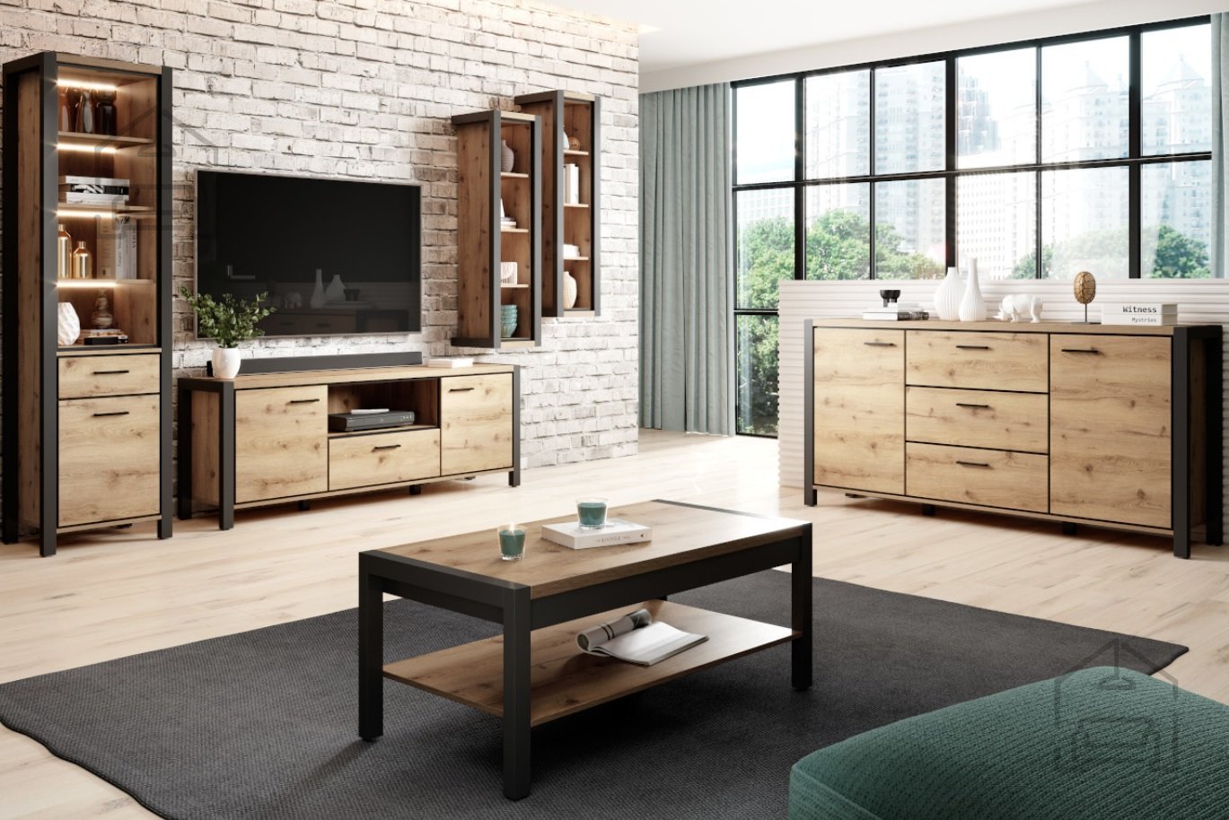 Die Wohnzimmermöbelkollektion AKTIV ist im industriellen Stil gestaltet, der sich durch Schlichtheit der Formen, Robustheit und Funktionalität auszeichnet. Die ungewöhnliche Verarbeitung der Möbel verleiht jedem Interieur einen einzigartigen Charakter. Auf der Basis der natürlichen Holzfarbe mit charakteristischer Textur und Maserung wird ein tiefes Schwarz eingefasst. Diese Kombination wirkt sehr dynamisch, kontrastreich und zugleich perfekt! Die Sammlung mehrerer Elemente bietet unbegrenzte Gestaltungsmöglichkeiten, während praktische Designlösungen die Schaffung eines schönen und funktionalen Wohnzimmers ermöglichen.