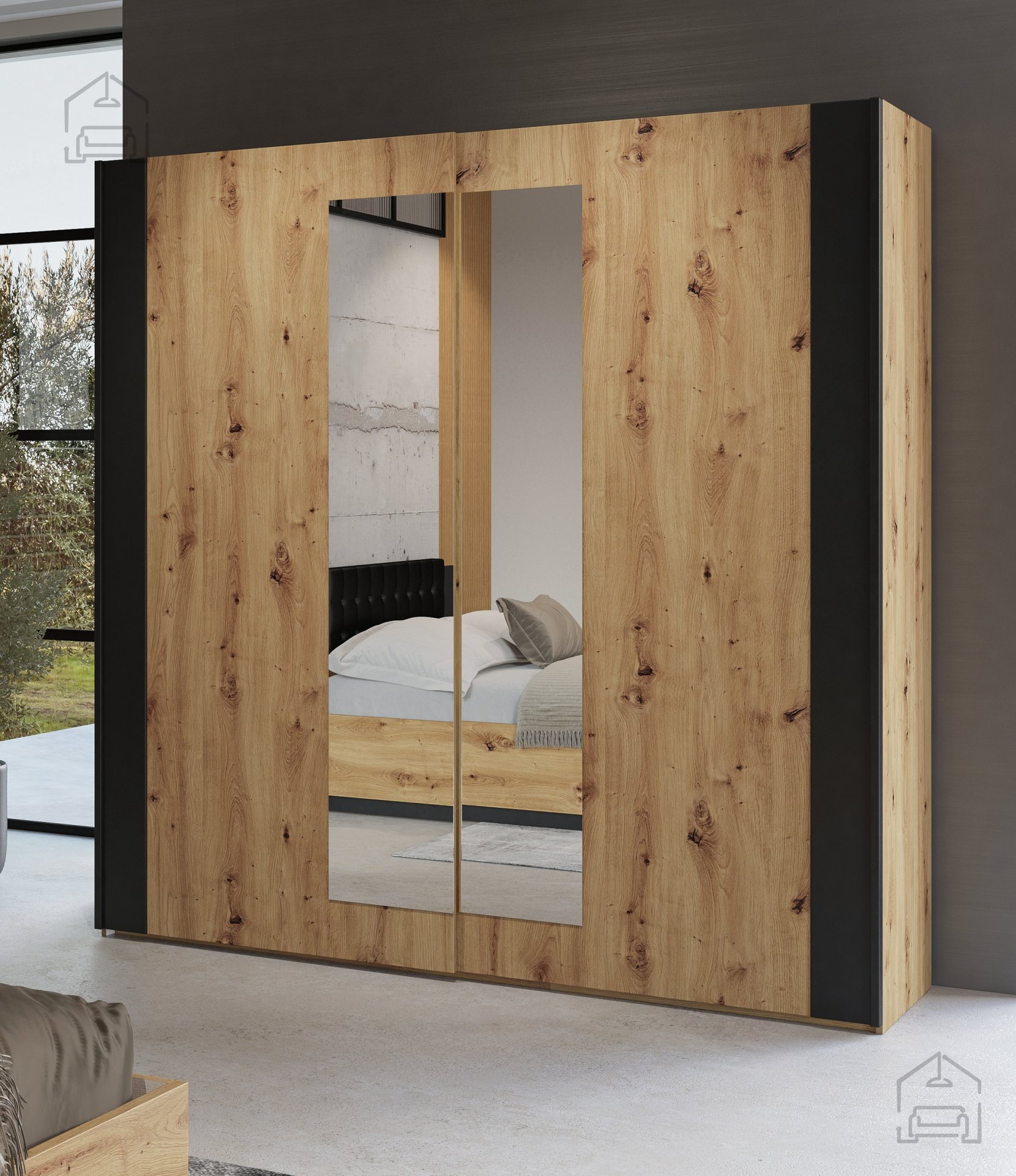 Willkommen in der Welt zeitloser Eleganz und Praktikabilität mit unserem hochwertigen Kleiderschrank Sigma, entworfen für alle, die höchste Qualität und anspruchsvolles Design schätzen. Der Schrank Sigma, mit den Maßen 200x64x213 cm, in der Farbkombination Artisan Eiche und Schwarz, ist mehr als nur ein Möbelstück; er ist ein Kunstwerk, das Ihren Raum auf ein neues Niveau hebt.