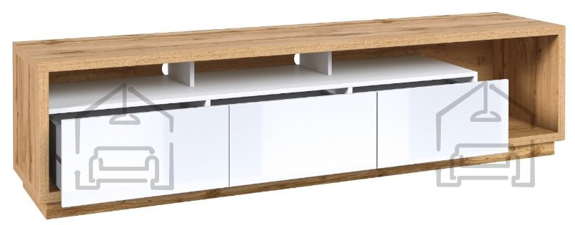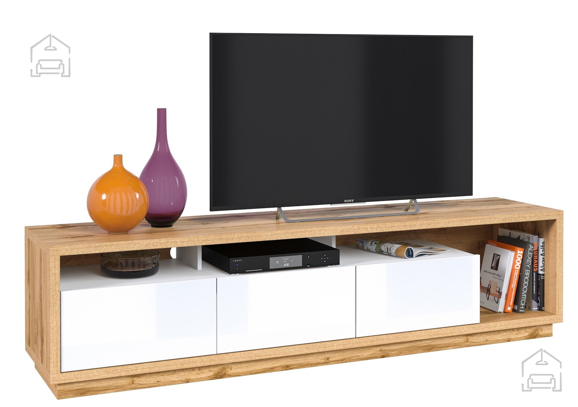 Diese beeindruckende Kommode misst 200x45x50 cm und bietet somit ausreichend Platz für Ihren Fernseher sowie zahlreiche Zubehörteile wie DVD-Player, Spielkonsolen oder dekorative Elemente. Sie besteht aus einer hochwertigen Möbelplatte, die Langlebigkeit und eine lange Lebensdauer garantiert. Mit dem Farbschema Wotan Eiche und Weiß Hochglanz fügt sie sich mühelos in verschiedene Einrichtungsstile ein – von modern bis traditionell.