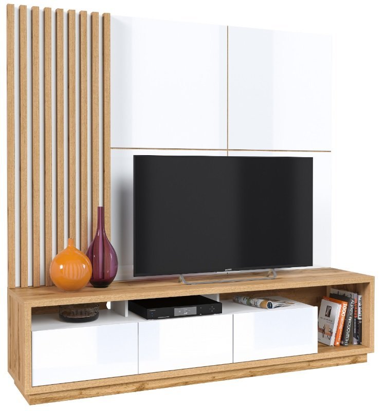 Das Wohnzimmer TV Regal Celine - Wotan Eiche/Weiß Hochglanz ist mehr als nur ein Möbelstück; es ist ein Ausdruck Ihres persönlichen Stils und Ihres Sinns für Ästhetik. Egal, ob Sie Ihr Wohnzimmer renovieren oder ein neues zentrales Möbelstück suchen – dieses Regal wird all Ihre Erwartungen erfüllen. Wählen Sie Qualität, Langlebigkeit und Eleganz mit dem Wohnzimmer TV Regal Celine. Treffen Sie eine kluge Investition in Möbel, die Ihnen viele Jahre dienen werden, und genießen Sie die perfekte Kombination aus Funktionalität und Stil.