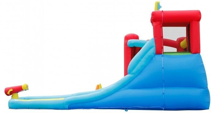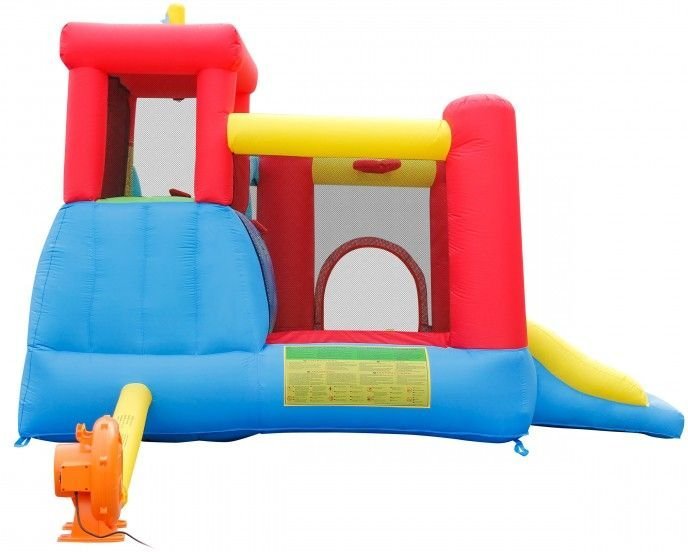 Die Konstruktion des Spielplatzes basiert auf einem bewährten System der kontinuierlichen Aufblasung, das durch das mitgelieferte elektrische Gebläse ermöglicht wird. Das Gerät muss während des Gebrauchs kontinuierlich eingeschaltet bleiben, um den optimalen Druck in den Kammern aufrechtzuerhalten und plötzliche Formänderungen zu verhindern. Das strapazierfähige PVC-Material ist beständig gegen mechanische Belastungen und Witterungseinflüsse und gleichzeitig flexibel genug, um Stöße zu dämpfen und eine weiche Landefläche bei Rutschvorgängen zu gewährleisten. Das Produkt verfügt über entsprechende Sicherheitszertifikate, die seine Eignung für den Heimgebrauch bestätigen.