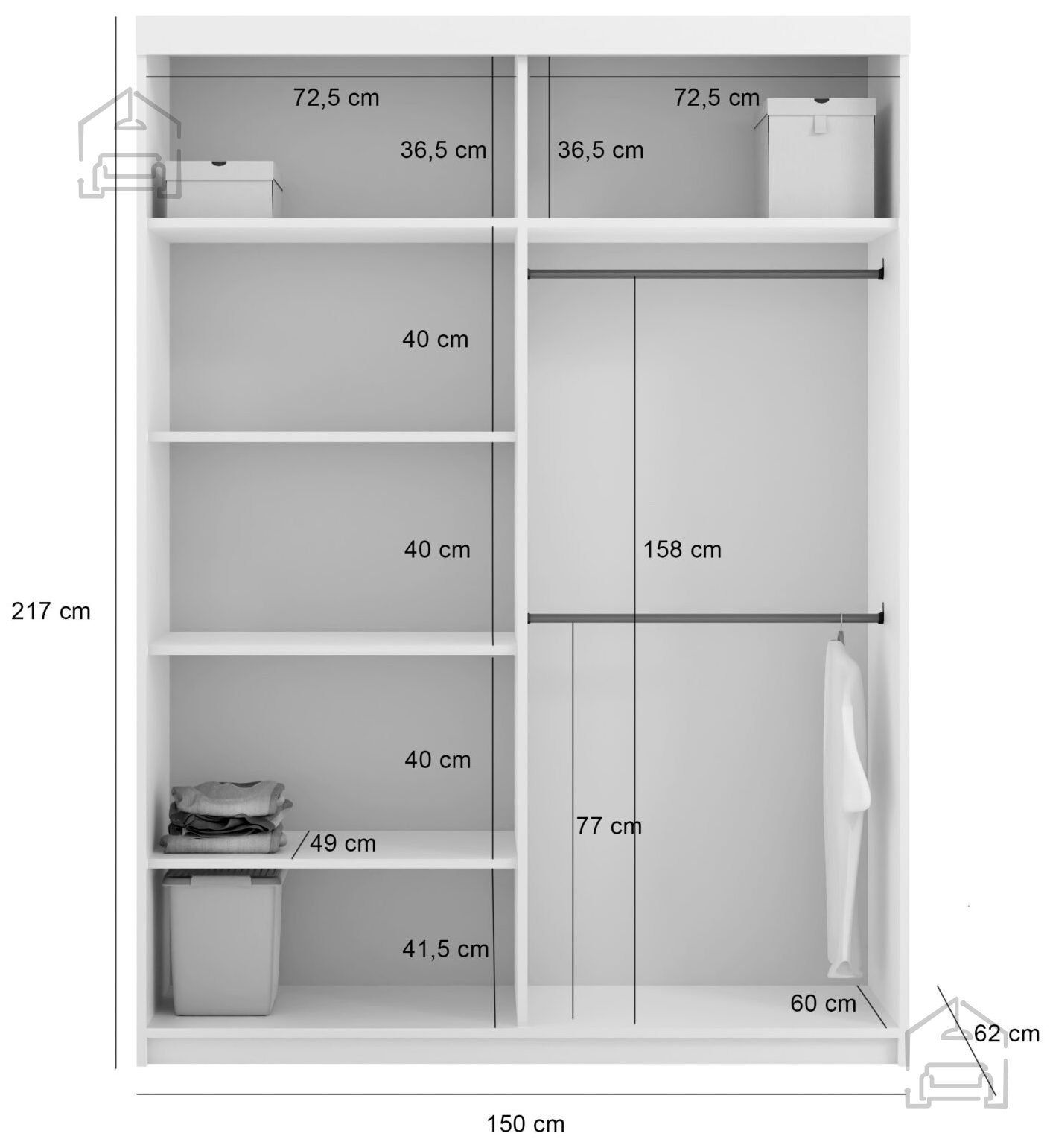 Größen- und Farboptionen: Der Schrank ist in der Größe 150 cm erhältlich und bietet verschiedene Farboptionen für den Korpus, wie Weiß, Schwarz, Wotan und Wenge. Die Frontteile der Schranktüren sind in denselben Farben erhältlich und verfügen zusätzlich über Elemente wie schwarzes Lacobel und Spiegel.