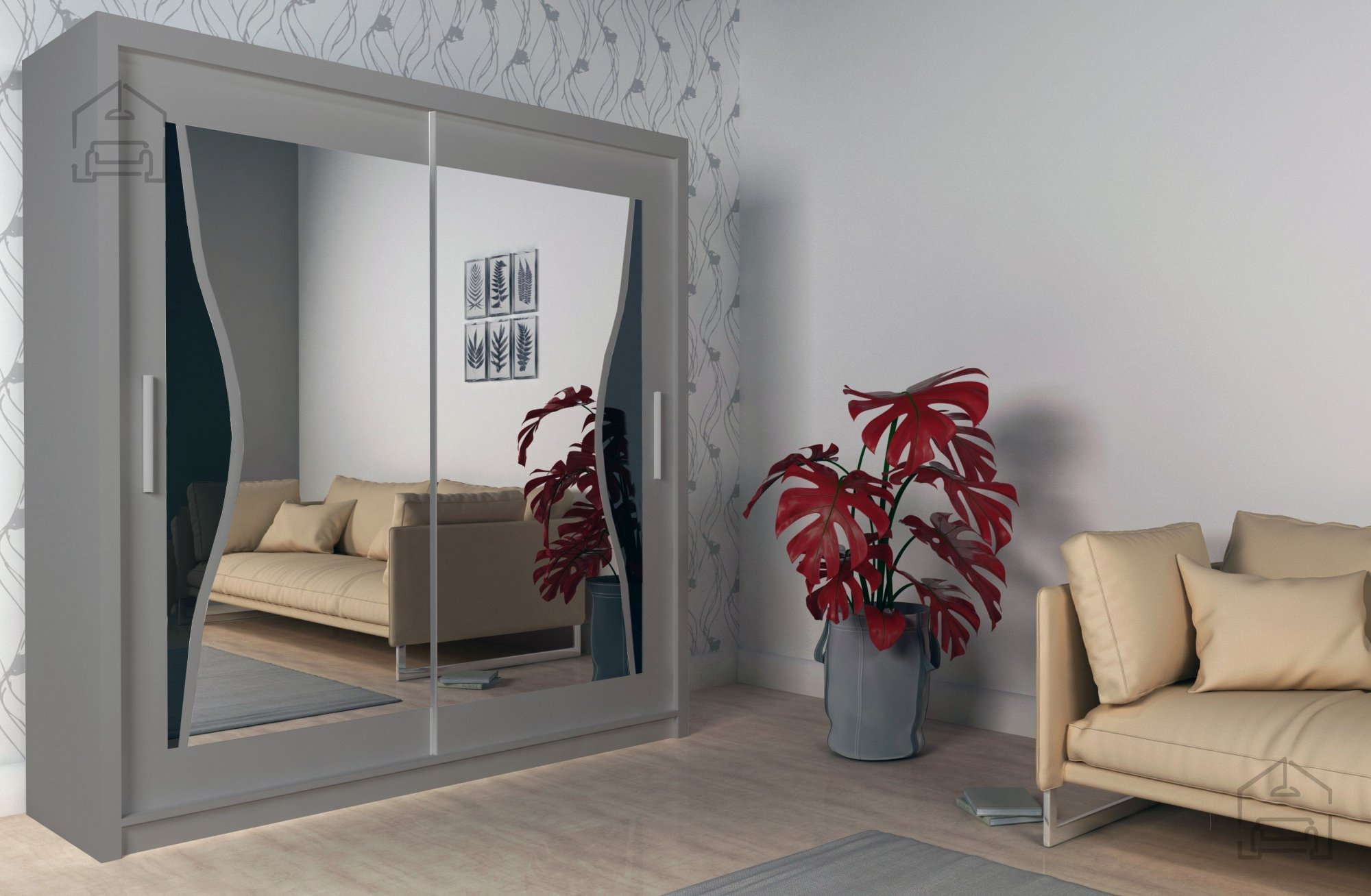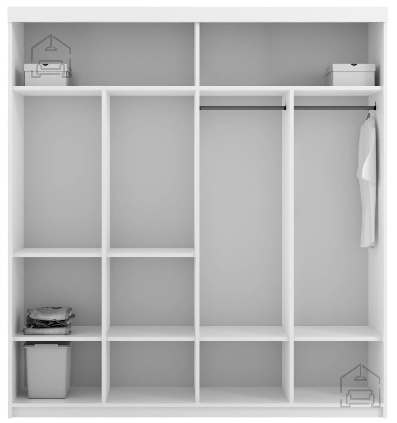 Drsna vrata z ogledalom: omara je opremljena z drsnimi vrati, kar omogoča enostaven dostop do notranjosti omare, obenem pa prihrani prostor v prostoru. Na srednjih vratih so nameščena ogledala, kar omogoča preverjanje videza in ustvarja občutek večje prostornosti.