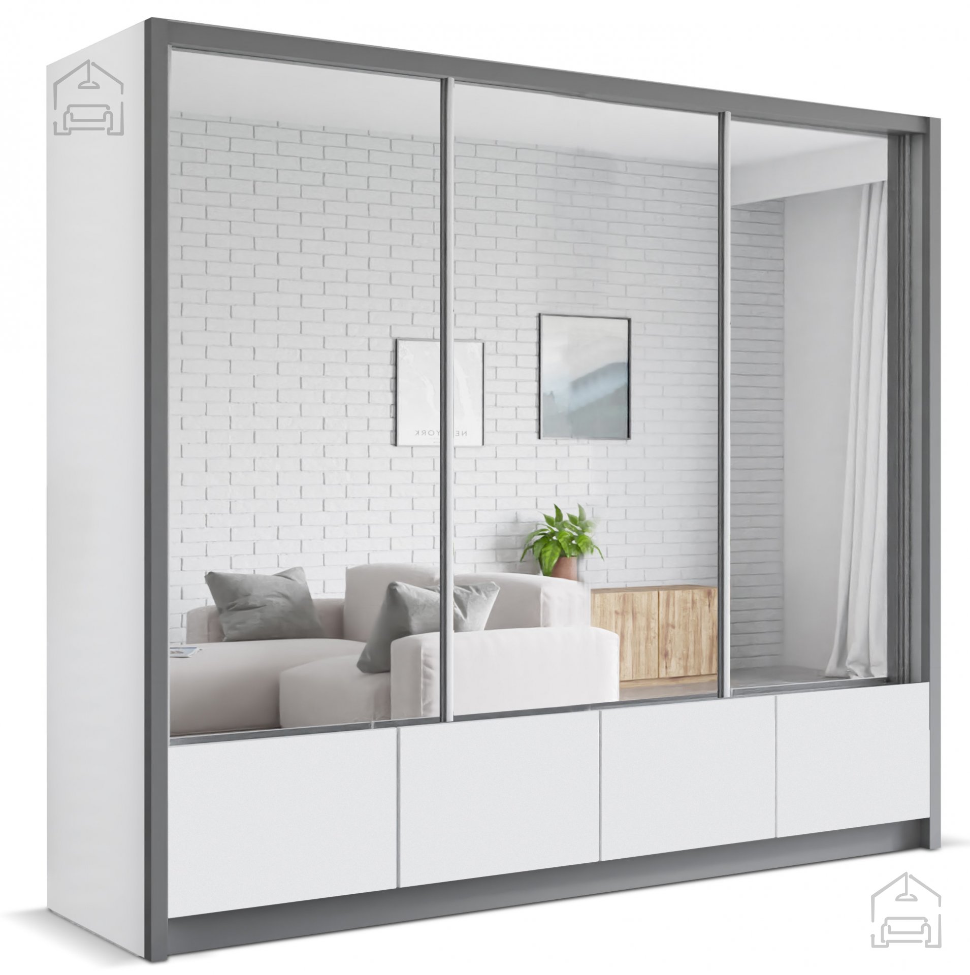 Der Kleiderschrank mit Schiebetüren Luis 250 ist ein stilvoll vollendetes und funktionales Möbelstück, das Ihr Schlafzimmer hervorragend ergänzen wird. Der Schrank ist in einer Kombination aus Weiß mit grauen Einsätzen erhältlich, was ihm ein modernes Aussehen verleiht.