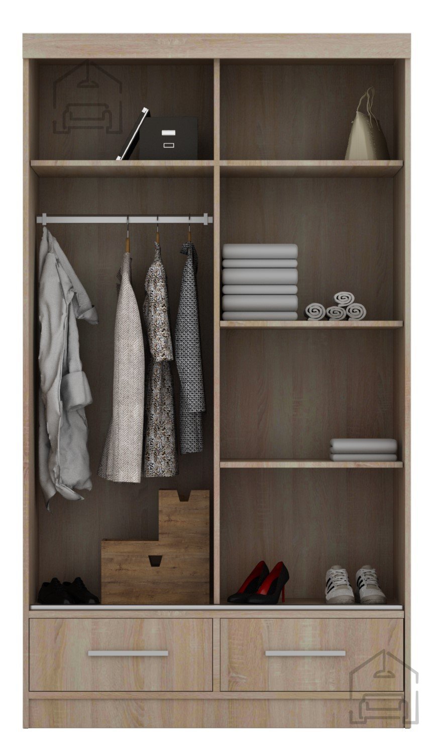 Das Innere des Kleiderschranks Margo Bis 120 ist so gestaltet, dass es eine übersichtliche Aufbewahrung verschiedener Kleidungsstücke ermöglicht. Im oberen Bereich befindet sich in der Regel Platz zum Aufhängen längerer Kleidungsstücke wie Mäntel und Kleider, während der untere Teil Raum für gefaltete Stücke, Schuhe oder Accessoires bietet. Die Schubladen im unteren Frontbereich sind stets auf die Korpusfarbe abgestimmt, was ein harmonisches Erscheinungsbild schafft und zusätzliche Praktikabilität bei der Organisation kleinerer Gegenstände bietet. Eine solche Aufteilung ermöglicht eine effiziente Raumnutzung und hilft, Ordnung im Kleiderschrank zu bewahren.