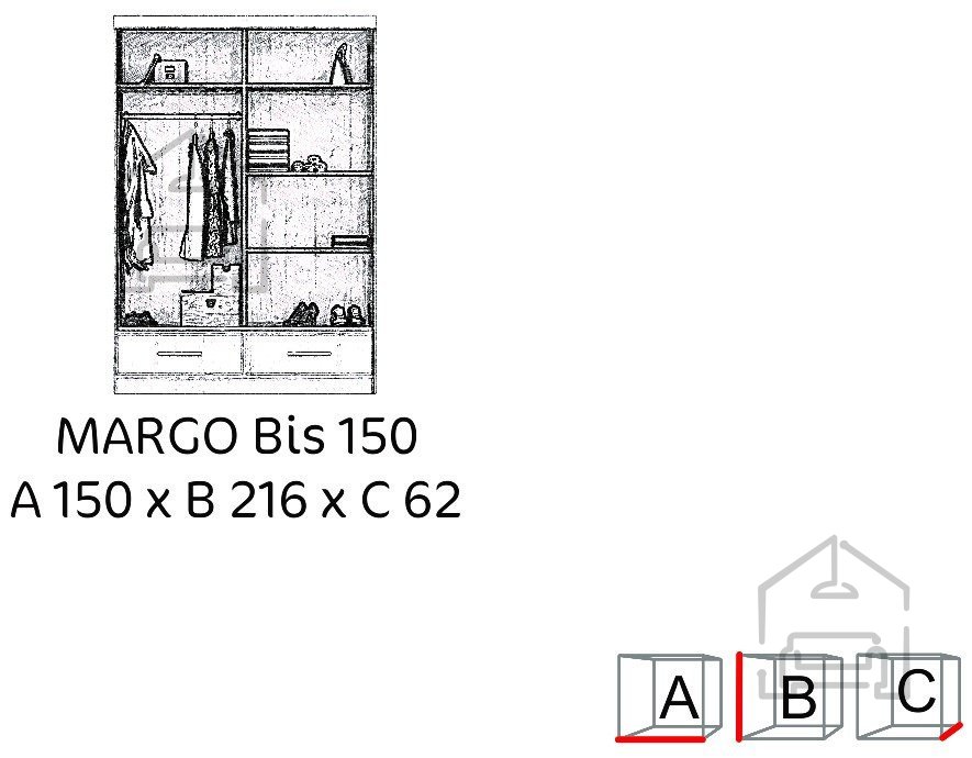 Der Schrank misst 150 cm in der Breite, 62 cm in der Tiefe und 216 cm in der Höhe. Diese Angaben zeigen, dass es sich um ein Modell handelt, das viel Stauraum bietet, ohne zu viel Platz im Raum einzunehmen. Dank seiner Höhe ermöglicht er eine effiziente Nutzung des Raums bis zur Decke, was besonders in kleineren Wohnungen oder Räumen wichtig ist, in denen jeder Zentimeter wertvoll ist. Margo Bis 150 passt daher perfekt sowohl in Schlafzimmer als auch in Ankleidezimmer oder Wohnräume, in denen zusätzlicher Stauraum benötigt wird.