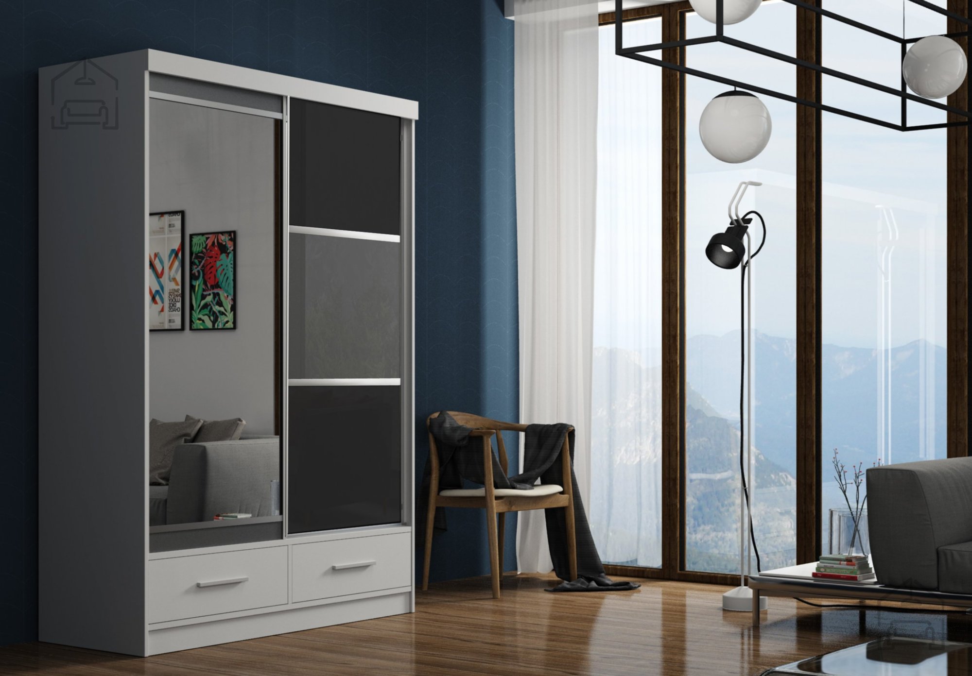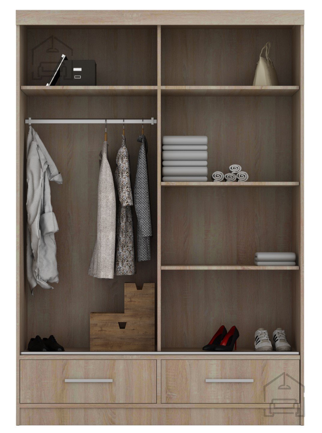Im Inneren gibt es genügend Platz zur Aufbewahrung von Kleidung an Kleiderbügeln, Regalen und in Schubladen. Die unteren Schubladen sind eine praktische Lösung zur Aufbewahrung kleinerer Kleidungsstücke wie Unterwäsche, Accessoires oder saisonaler Modeartikel. Das Design ermöglicht eine übersichtliche Anordnung der Gegenstände, was die tägliche Organisation erleichtert und Zeit beim Suchen von Kleidung spart.
