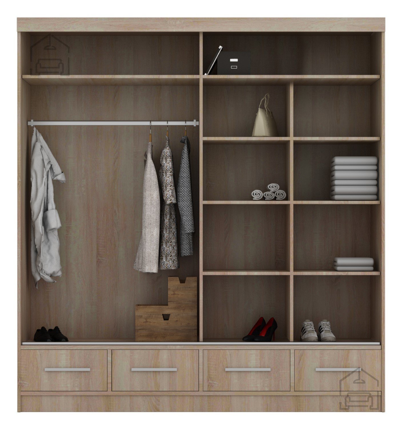 Der Schrank Margo Bis 250 ist für Benutzer konzipiert, die Ordnung, Ästhetik und hochwertige Verarbeitung schätzen. Dank der klaren Linien und der durchdachten Details passt er sowohl zu modernen als auch zu klassischen Interieurs. Im Schlafzimmer bietet er ausreichend Platz für Kleidung, im Wohnzimmer kann er als multifunktionaler Schrank zur Aufbewahrung verschiedener Gegenstände dienen. Der Schiebemechanismus ermöglicht einen einfachen Zugang zum Inhalt, während der Spiegel und die Farbkontraste einen angenehmen visuellen Effekt erzeugen.