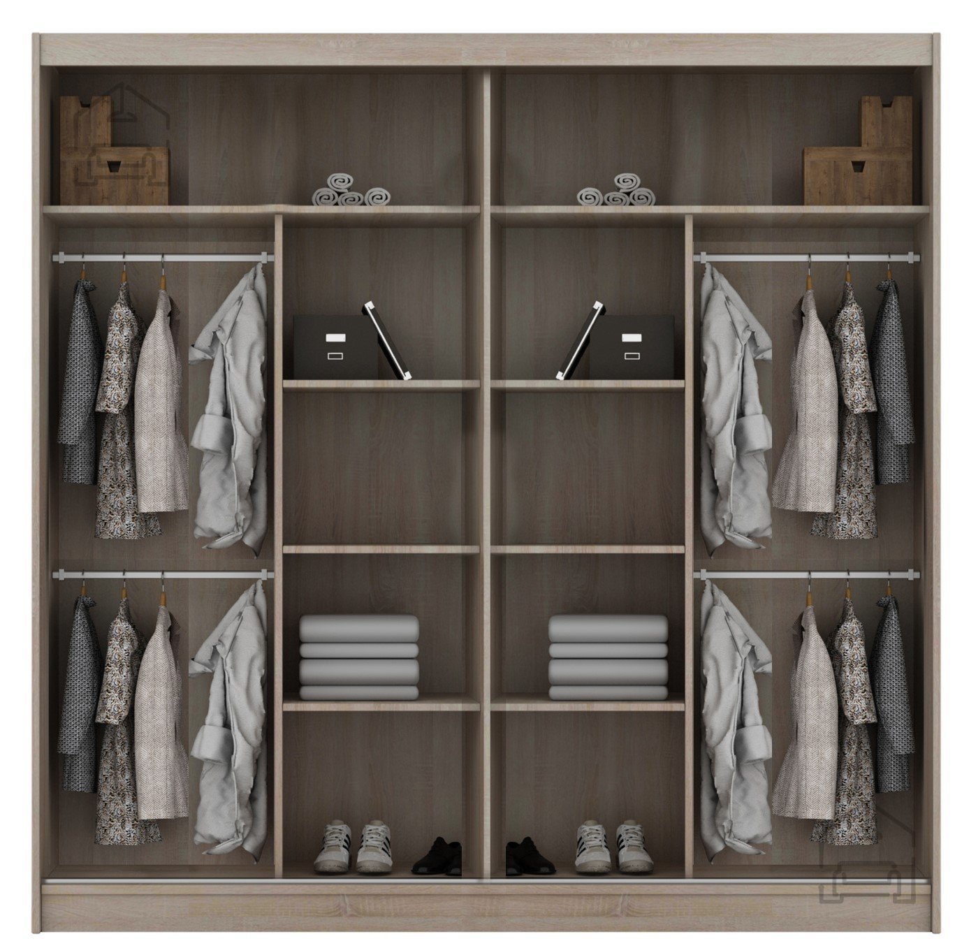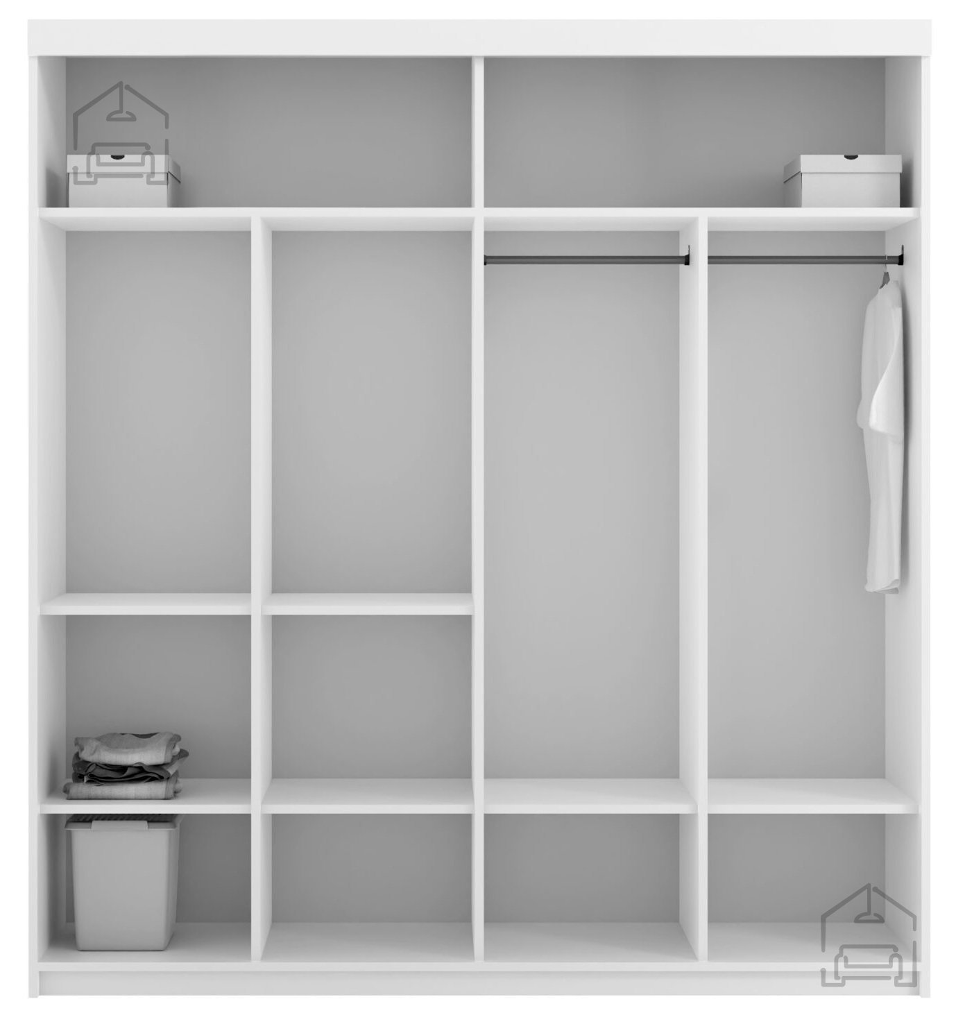 Das Innere des Schranks ist auf praktische Nutzung und übersichtliche Aufbewahrung ausgelegt. Der geräumige Innenraum ermöglicht verschiedene Anordnungen von Regalen und Kleiderstangen, was Ihnen Freiheit bei der Organisation von Kleidung, Schuhen und Accessoires gibt. Der Schrank Marika 200 bietet genügend Platz für lange Kleidungsstücke, gefaltete Stücke und saisonale Artikel, sodass Sie immer einen ordentlichen und übersichtlichen Garderobenbereich haben.