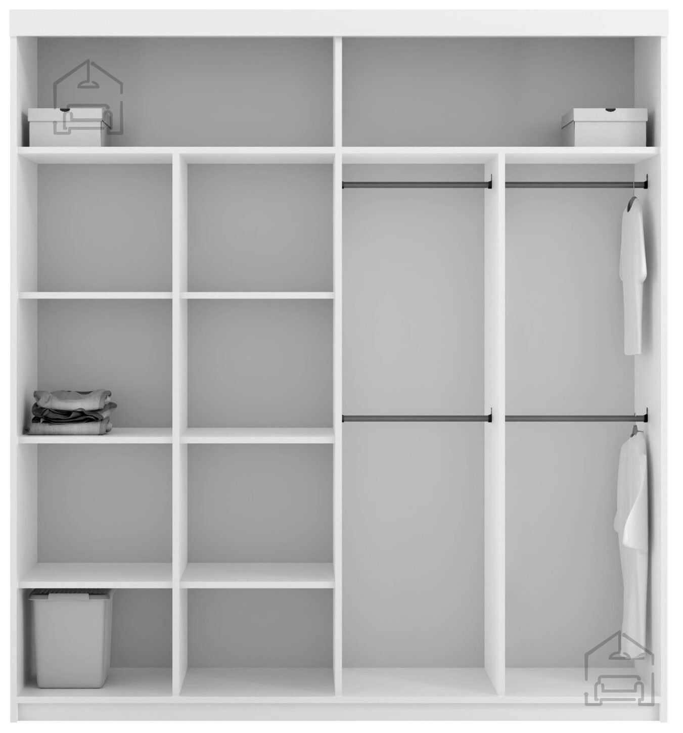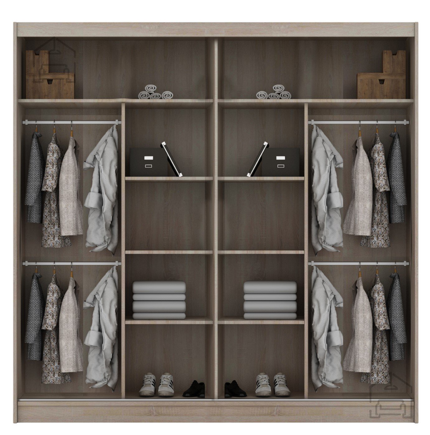 Schiebetüren: Der Schrank verfügt über zwei Schiebetüren, die sich auf stabilen Führungen bewegen. Dies ermöglicht ein sanftes und leises Öffnen und Schließen der Türen, was praktisch und funktional ist.