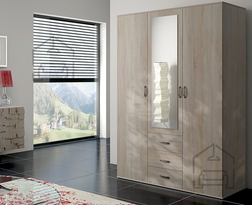 Farbkombination: Der Korpus des Schranks ist in Weiß oder Sonoma-Eiche erhältlich, während die Fronten in der Kombination Sonoma-Eiche/Weiß mit einem Spiegel ergänzt sind. Dies schafft ein Gleichgewicht zwischen der Wärme des Holzes und dem Licht des Spiegels.
