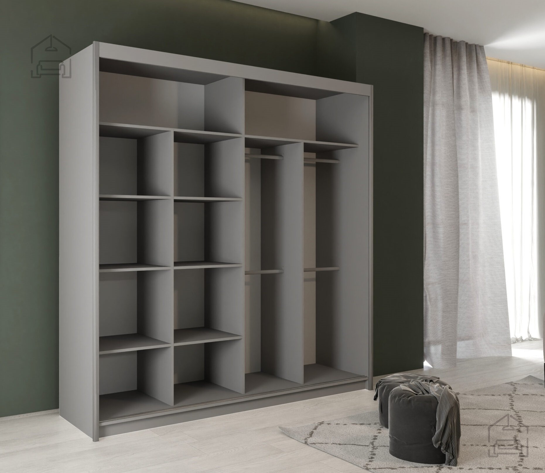 Der Kleiderschrank mit Schiebetüren Pesto ist eine ausgezeichnete Wahl für diejenigen, die hochwertige und ästhetisch ansprechende Möbel zur Aufbewahrung von Kleidung suchen. Mit seinem durchdachten Innenraum ermöglicht er eine ordentliche Aufbewahrung und Organisation Ihrer Garderobe, während sein elegantes Design zum ästhetischen Erscheinungsbild Ihres Raumes beiträgt.