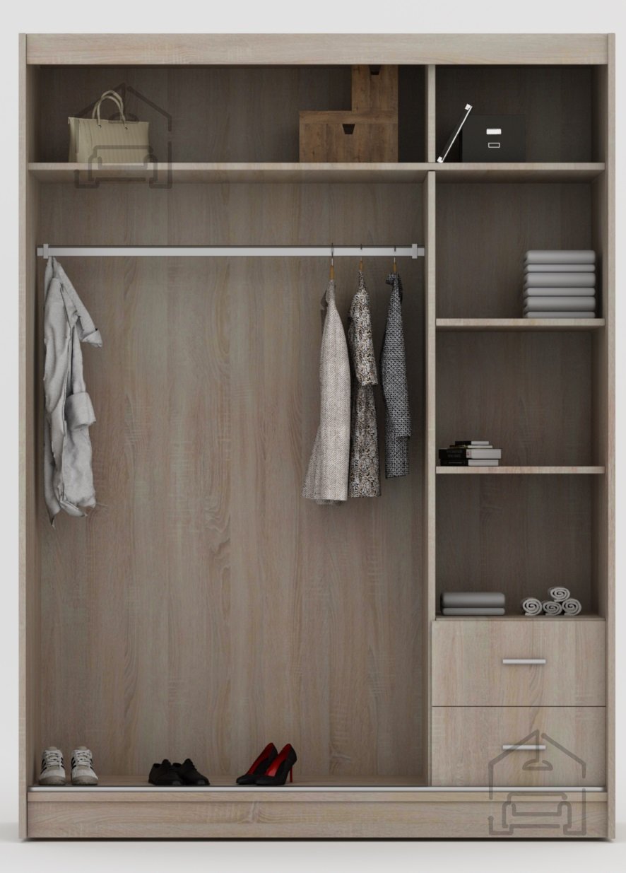 Schiebetüren und Spiegel: Der Schrank ist mit einem sehr stabilen Schiebetürsystem ausgestattet, das eine reibungslose Bewegung ermöglicht. Der Spiegel ist mit dekorativen Elementen verziert, die zu seinem attraktiven Erscheinungsbild beitragen.