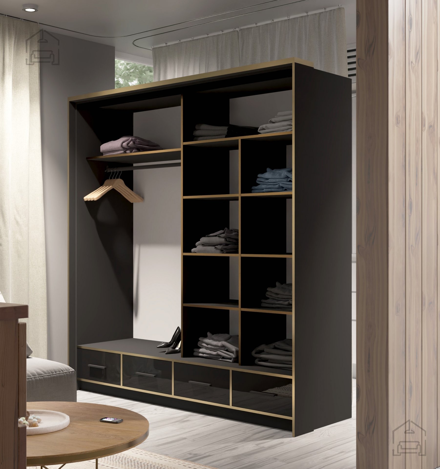 • Der Schrank ist mit Schiebetüren ausgestattet, die einen einfachen Zugang zum Inneren des Schranks ermöglichen und gleichzeitig Platz im Raum sparen.