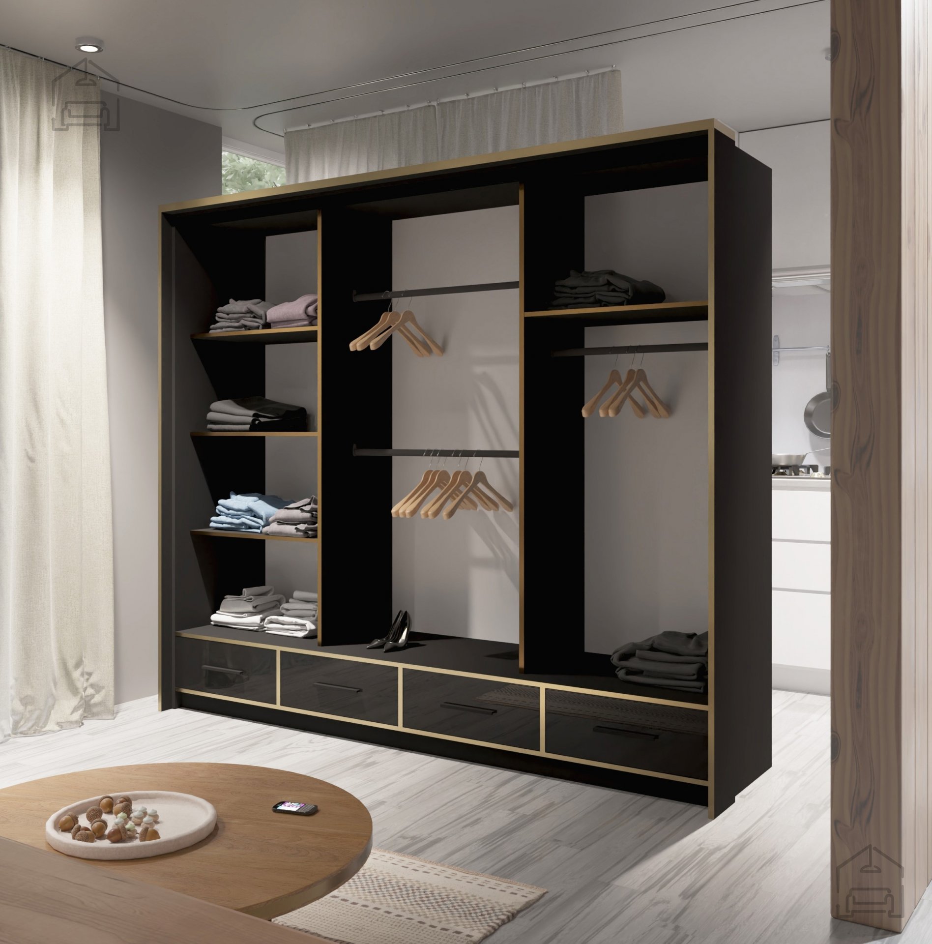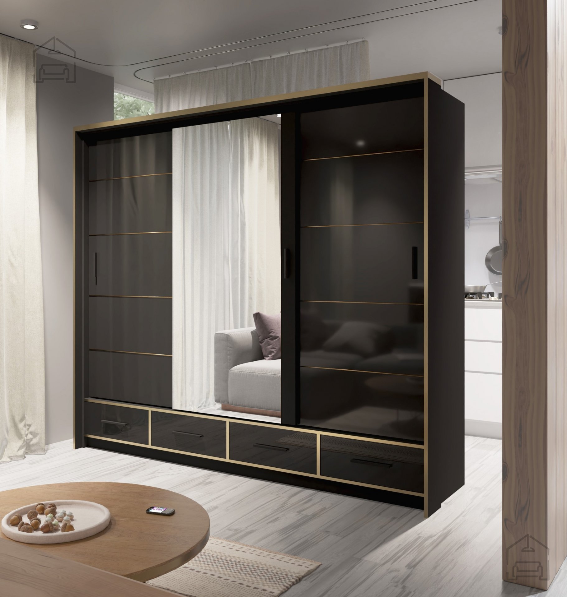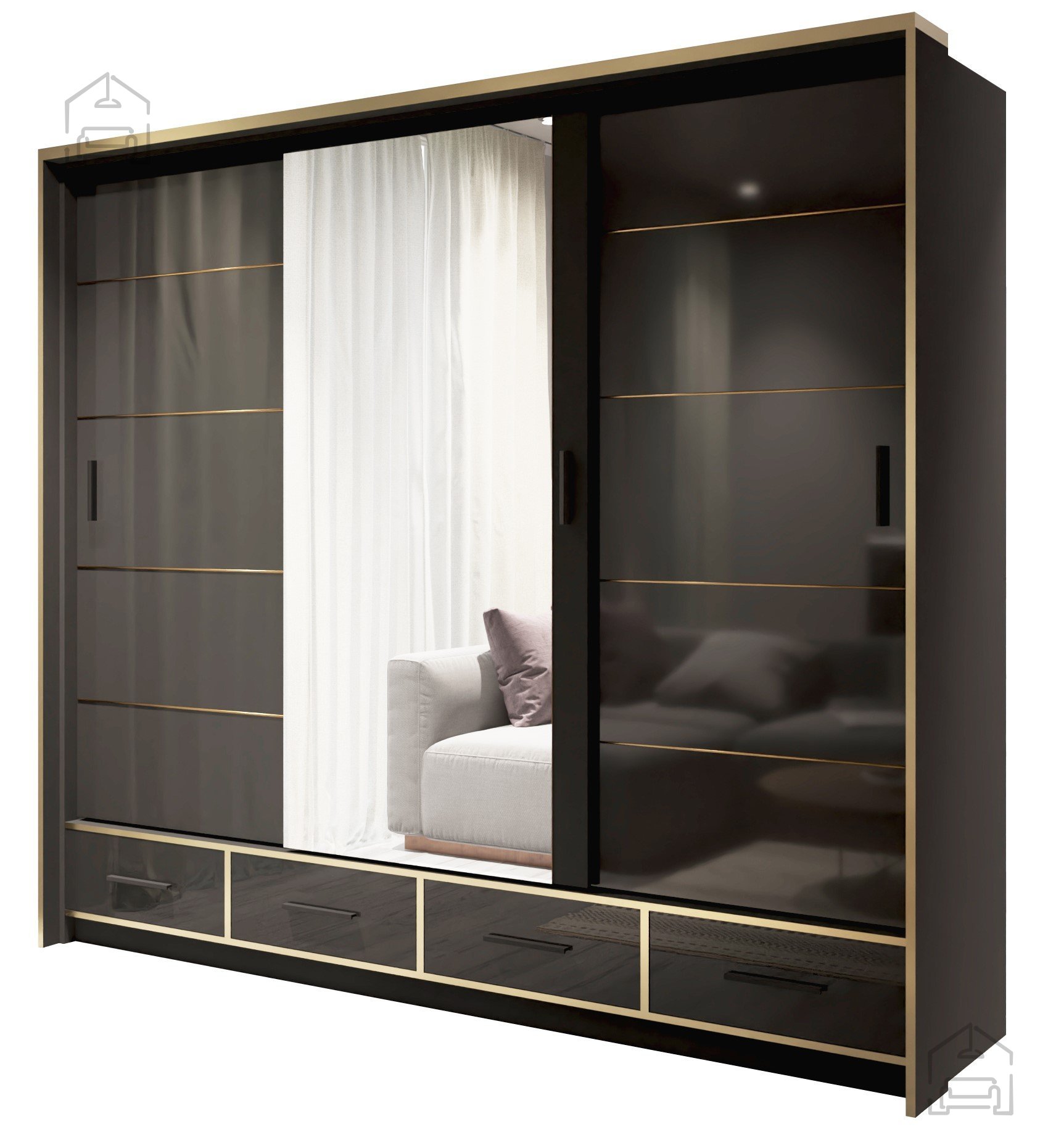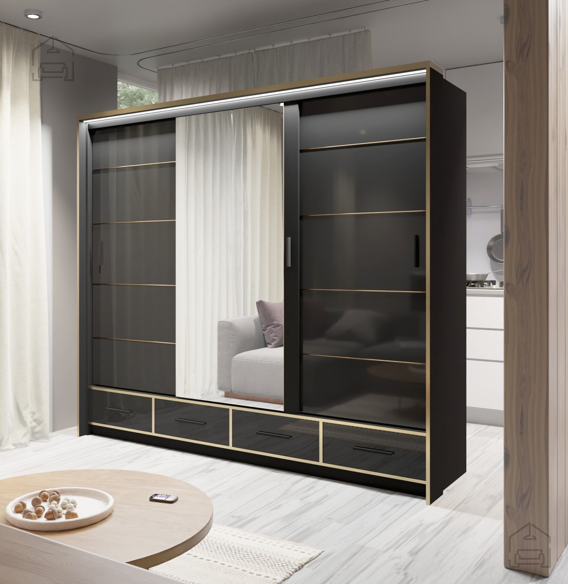 Der Kleiderschrank mit Schiebetüren Sevilla LED stellt eine Kombination aus außergewöhnlichem Design und Funktionalität dar. Dieser Schrank wird Liebhaber der Ästhetik anziehen und zugleich eine praktische Aufbewahrung Ihrer Garderobe gewährleisten.