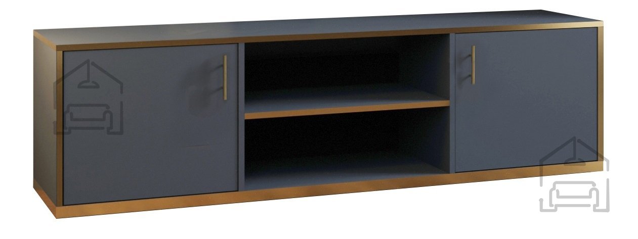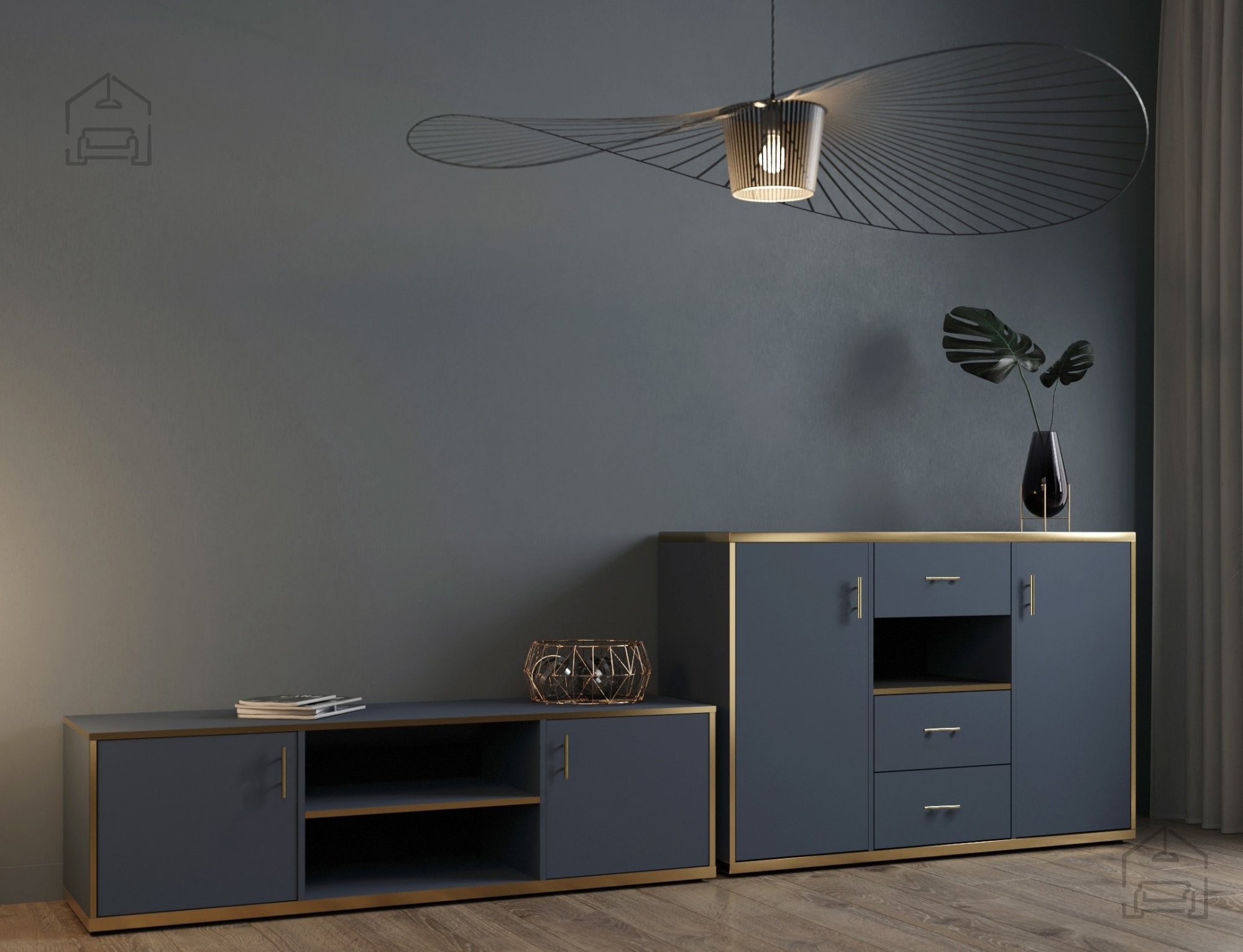 Farbkombination: Der Korpus der TV-Kommode ist in blauer Farbe mit goldenen Furnieren ausgeführt, was ein außergewöhnliches und ansprechendes Erscheinungsbild schafft. Die Vorderseite der Kommode ist ebenfalls blau, was für Harmonie im Farbambiente sorgt.