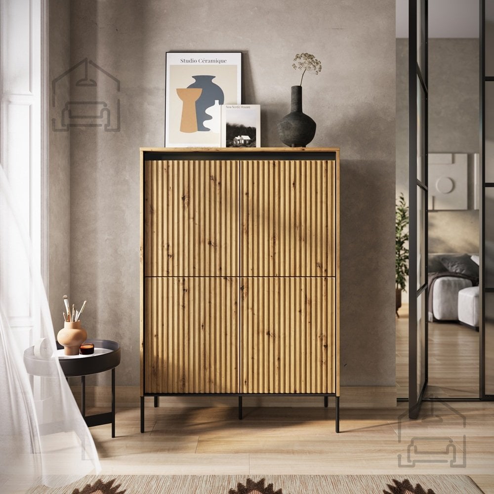 Die Kommode ist nicht nur eine funktionale Lösung, sondern auch ein ästhetisches Element für Ihr Interieur. Dank der klaren Linien und des minimalistischen Designs passt die Kommode zu verschiedenen Einrichtungsstilen, von modern über skandinavisch bis klassisch. Das moderne Design der Kommode frischt den Raum optisch auf, bringt eine angenehme Atmosphäre und Leichtigkeit hinein, und das gerippte Muster auf den Fronten folgt den neuesten Trends in der Inneneinrichtung. Sie ist ideal für die Platzierung in verschiedenen Bereichen des Hauses wie Schlafzimmer, Wohnzimmer oder Flur.