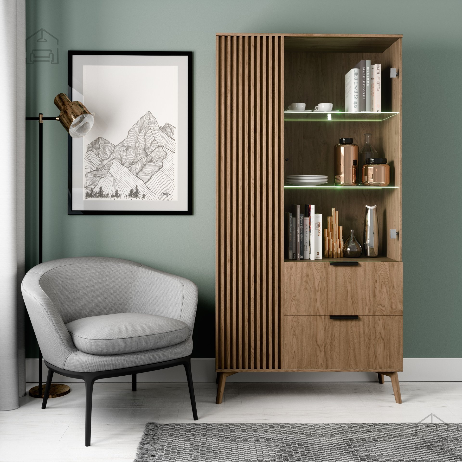 Die Vitrine Entsian bietet viel Stauraum im Wohnzimmer. Sie ist Teil der Möbelkollektion für Wohnzimmer und Schlafzimmer Entsian.