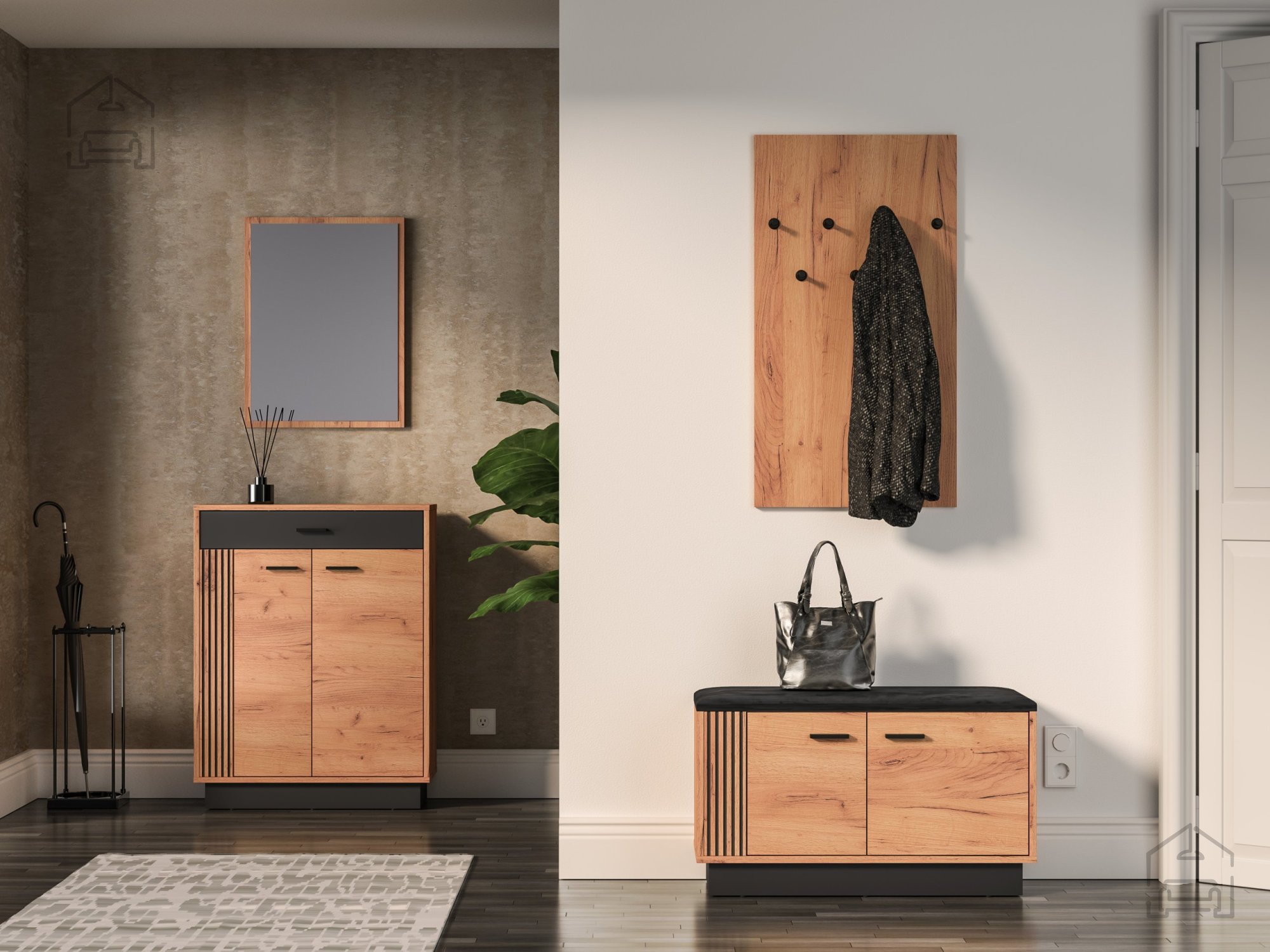 • Das Garderobenset Vasco ist ein modernes und funktionales Möbelset in der Kombination aus goldenem Eichenholz und starkem Schwarz.