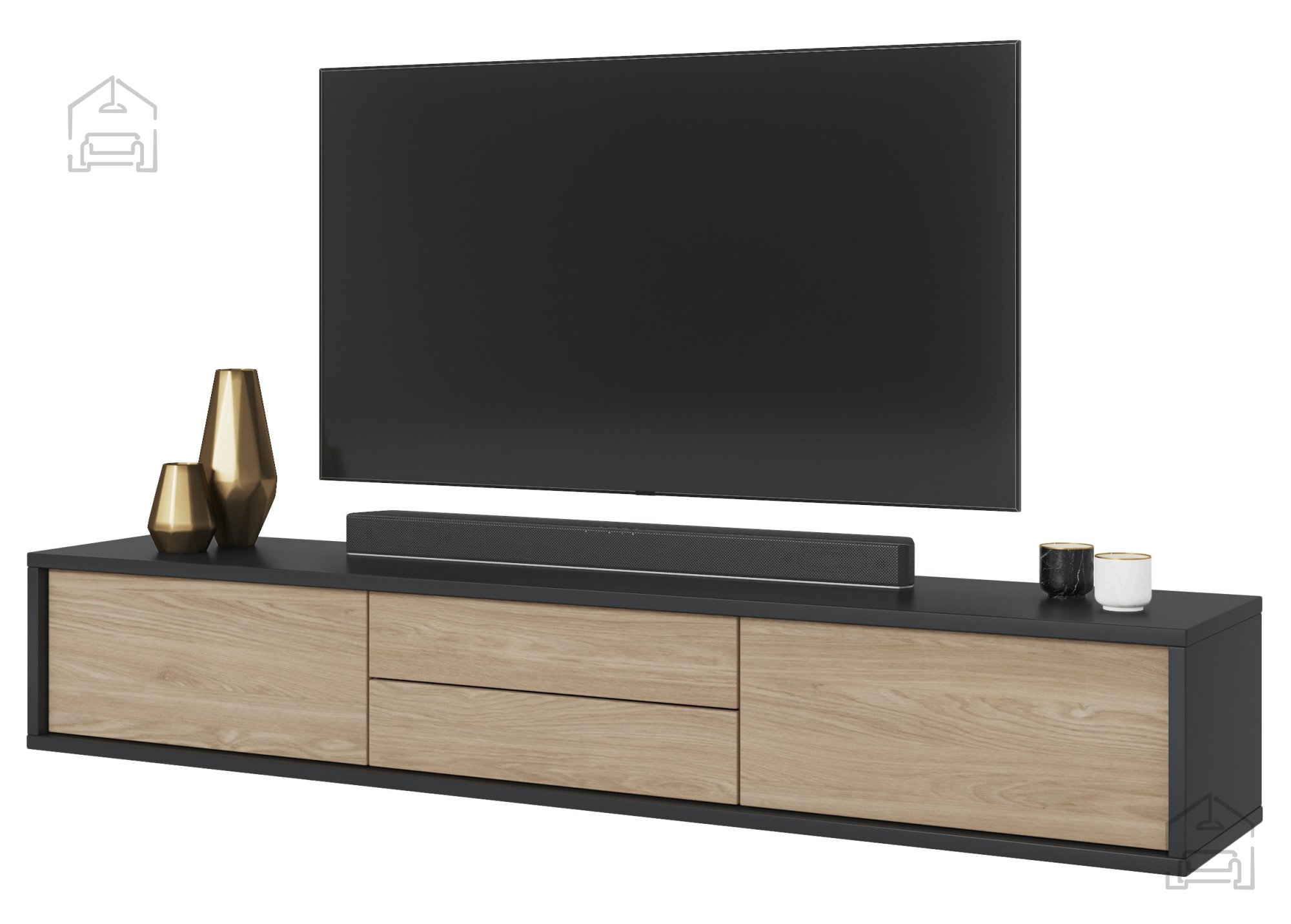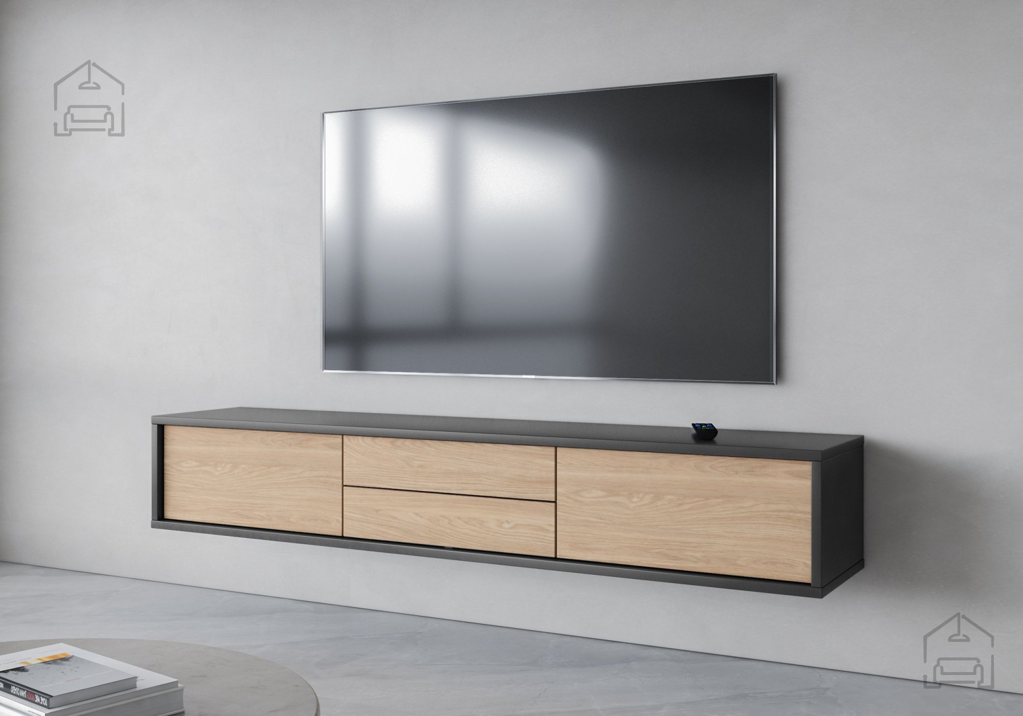 Die TV-Kommode Frida 2K2S wurde mit Blick auf modernes Wohndesign entworfen. Die anthrazitfarbene Oberfläche in Kombination mit geölter Eiche schafft einen ansprechenden Kontrast, der sich mühelos in verschiedene Einrichtungsstile einfügt. Ihre elegante Form ist ideal für alle, die ein Faible für Minimalismus und dezente Eleganz haben.