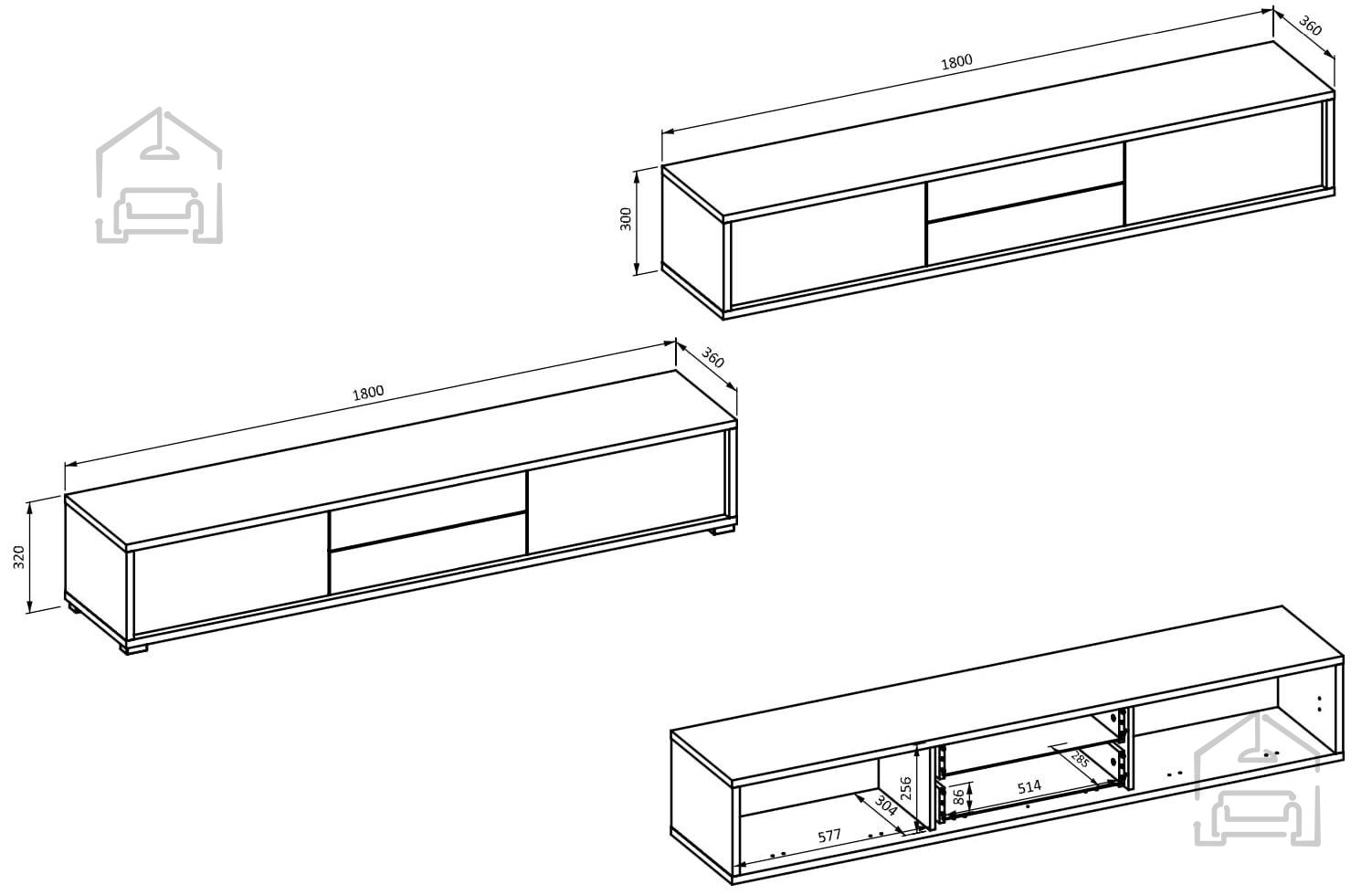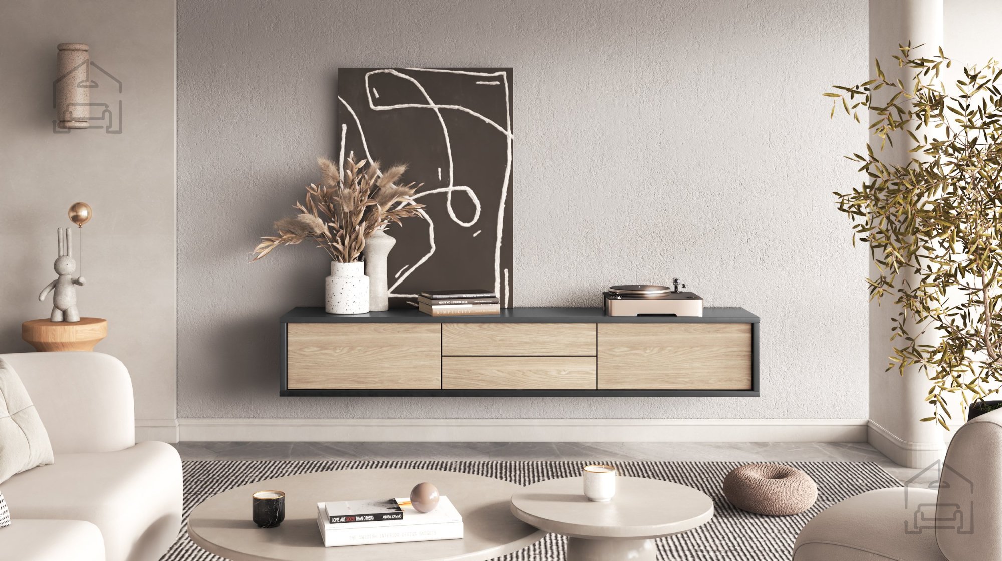Die Kommode verfügt über zwei geräumige Schubladen und zwei geschlossene Fächer, die reichlich Stauraum für Fernbedienungen, Kabel, DVDs und andere Geräte bieten. So bleibt Ihr Wohnzimmer stets ordentlich und gut organisiert.