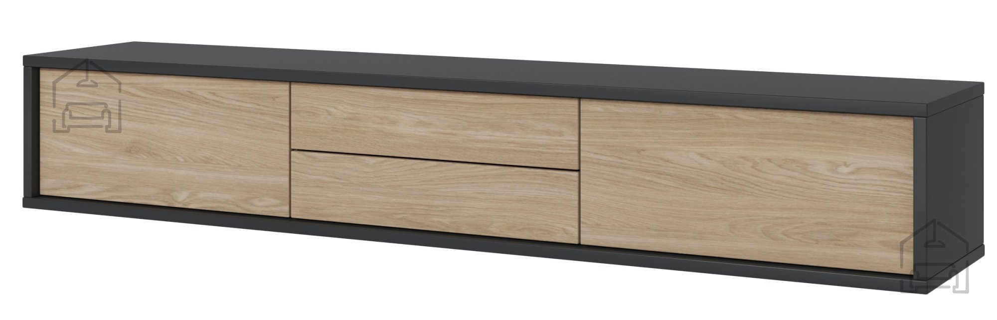 Die TV-Kommode Frida 2K2S mit den Maßen 180x36x32 cm bietet ausreichend Platz für Ihren Fernseher, Unterhaltungselektronik und dekorative Accessoires. Der Korpus besteht aus hochwertiger, laminierter Spanplatte, die für Stabilität und Langlebigkeit sorgt. Die Kombination aus Anthrazit und geölter Eiche verleiht jedem Raum eine warme und elegante Note.