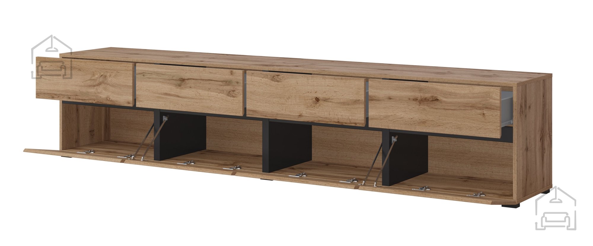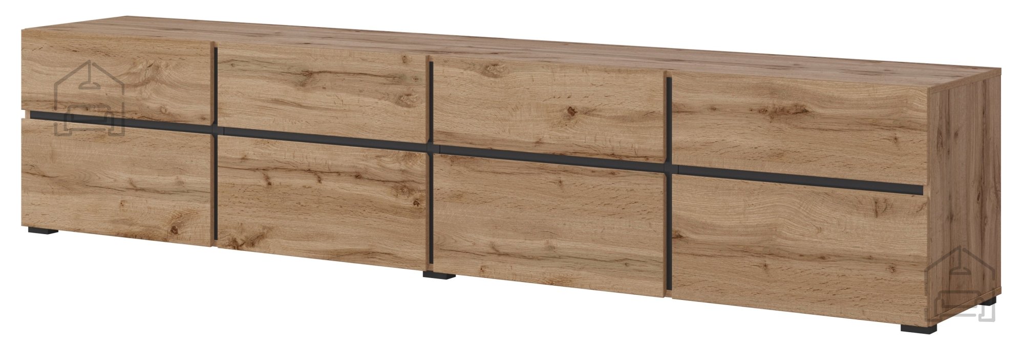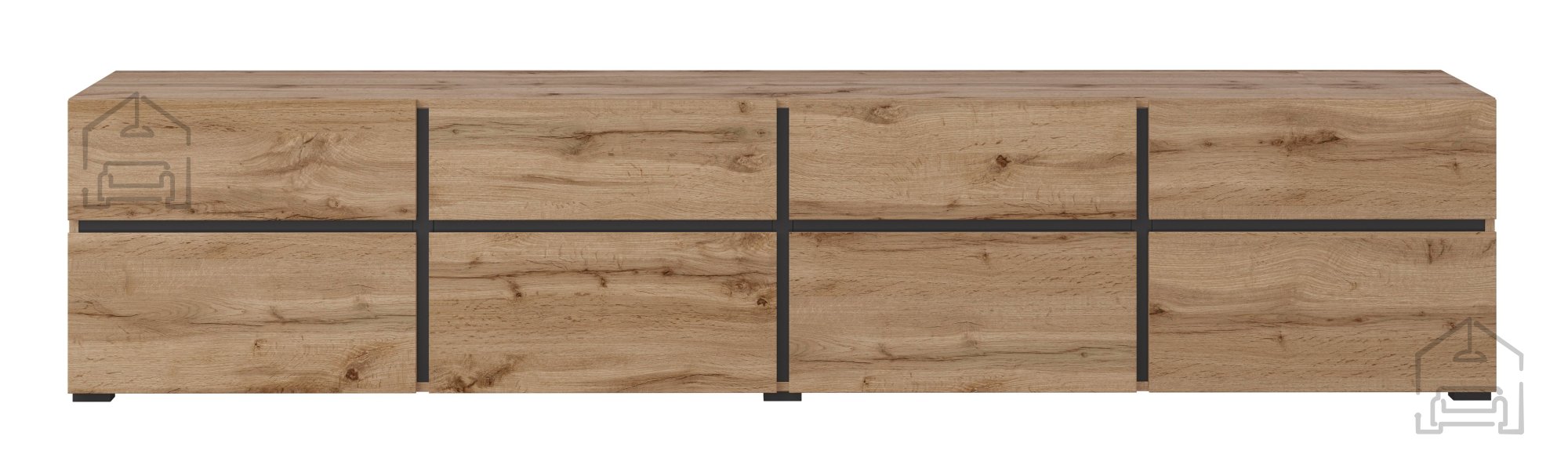 Die TV Kommode Cross - 24N6MY40 mit den Maßen 225x40x48 cm bietet ausreichend Platz für all Ihre Multimedia-Geräte wie Fernseher, Spielkonsolen, Lautsprecher und vieles mehr. Mit ihrem eleganten Design und der Farbkombination Eiche Votan/Schwarz ergänzt und hebt diese Kommode nicht nur die Ästhetik Ihres Raumes hervor, sondern verleiht ihm auch eine besondere Note. Die Farbe Eiche Votan bringt Wärme und Behaglichkeit, während die schwarzen Elemente einen Hauch moderner Eleganz hinzufügen.